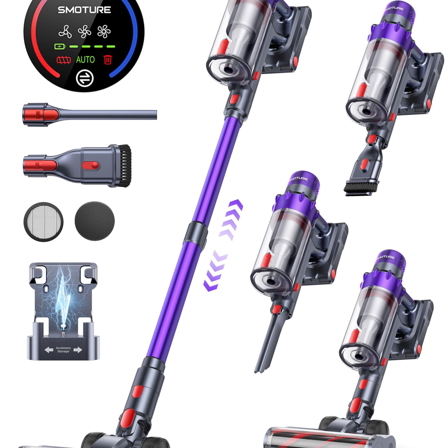 - [Touch Screen & AUTO Modes] Select AUTO mode, the self-standing vacuum cleaner will automatically increase suction power when passing from floor to carpet to ensure deep cleaning. Switching to manual mode, you can freely adjust the ECO, STANDARD and MAX modes through the touch screen. Auto mode makes cleaning smarter!