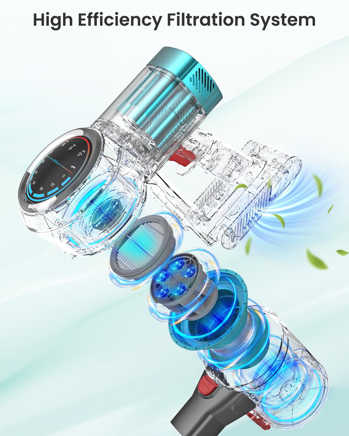 - 【Intuitive dual-screen display】The vacuum cleaner display allows you to control the machine status in real time. Intelligent prompts for fault content allows you to keep abreast of the real-time battery power, dust cup fullness, brush blockage and suction mode. With high-definition LED display, even the elderly can clearly read the vacuum cleaner status.