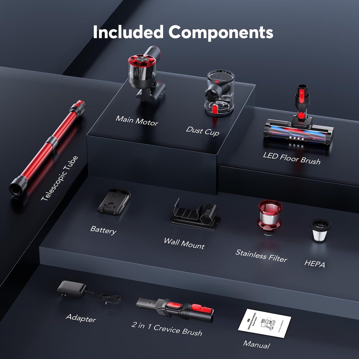 - ๐๐ก๐๐ญ ๐๐จ๐ฎ'๐ฅ๐ฅ ๐๐๐ญโ 1pcs Stick Vacuums Mainframe with dust cup,1pcs electric brushead & brush roller,1pcs 2,200mAh 6-cell lithium battery pack, 1pcs charger, 1pcs telescopic tube, 1pcs 2 in 1 crevice brush,1pcs HEPA set with welcome guide. ๐๐๐๐: after washing the dust cup and cotton filters, please make sure they are thoroughly dry before use again.