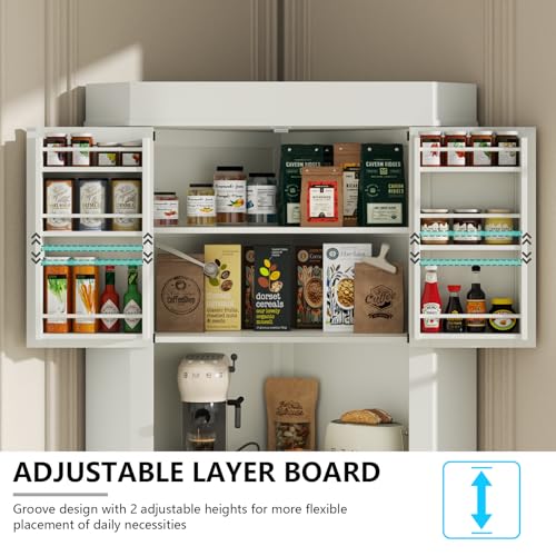 - 【Corner Cabinet with Handy Door-side Rack】 This kitchen pantry cabinet includes two convenient 3-layer door-side storage rack, each shelf measuring 2.9 inch,6.9inch,7.2inch in height. The second shelf is adjustable in height to meet the storage needs of products at different heights.Ideal for easy access to your favorite spices and small items