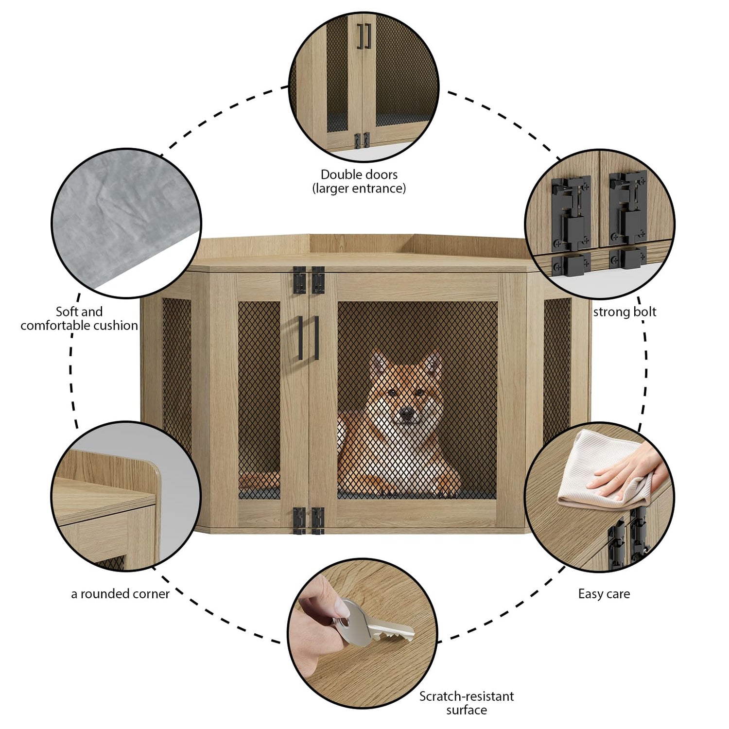 Corner Dog Crate Furniture - Dog Crate Cage for Small Medium Dogs, Wooden Indoor Aesthetic Puppy Kennel TV Stand, Modern Decorative Pet House Dog Cage, Light Oak