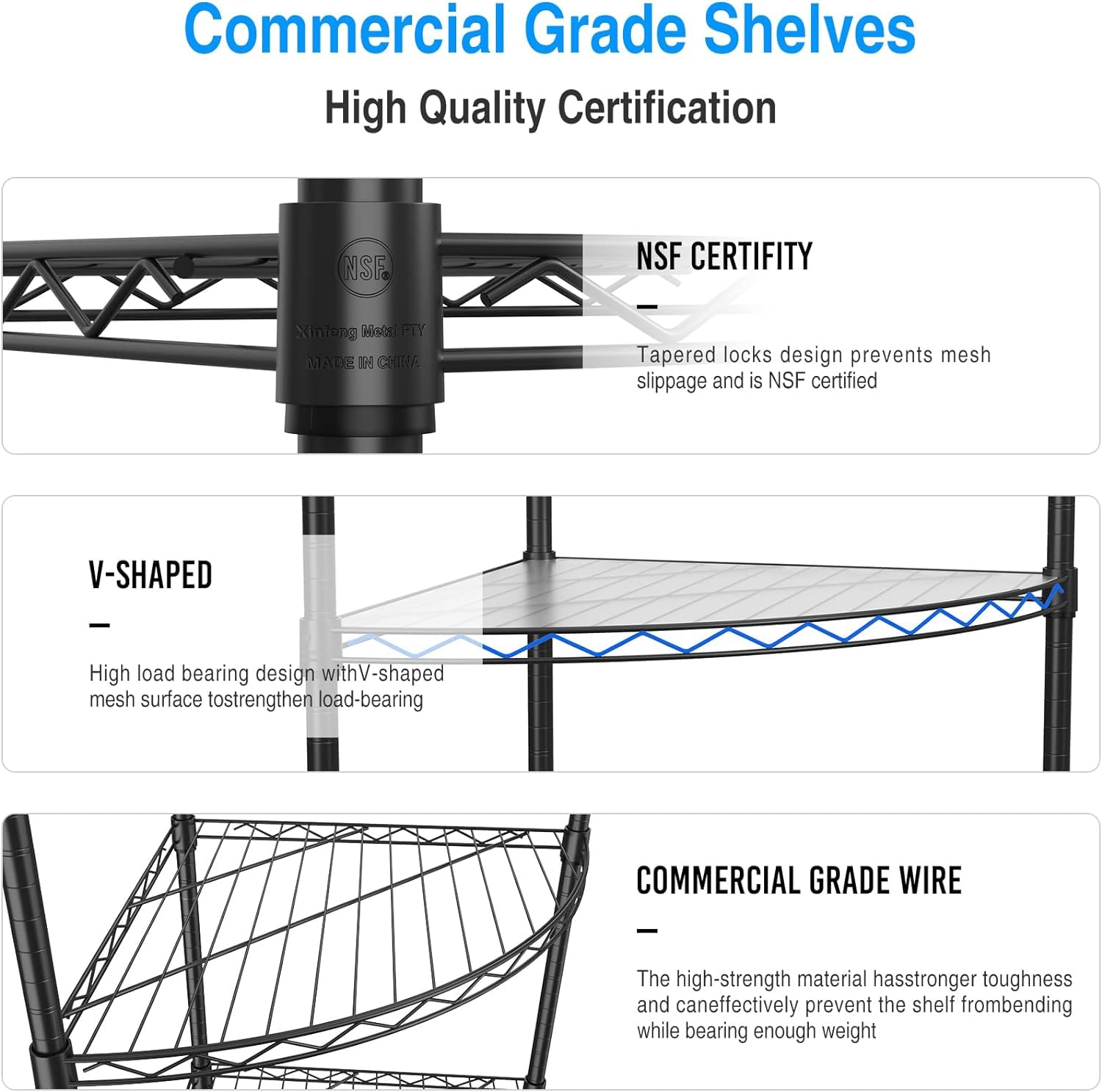 - EXTREMELY DURABLE: Made from heavy steel, the wire shelving is built to last and is resistant to rust and oxidation. The wire shelf liner is noted for its high quality, longevity, functionality, and aesthetic appeal, being thicker and more durable than many competitors' offerings. The shelving unit has passed NSF certification, ensuring it is a safe and reliable option for storage.
