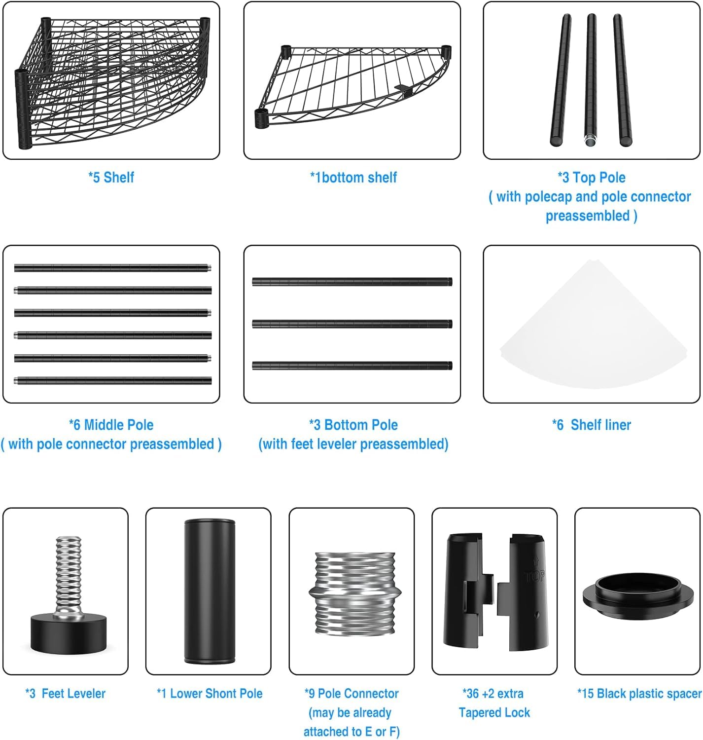 Corner Shelf Wire Shelving Unit, 6 Tier NSF Metal 420lbs Capacity Heavy Duty Adjustable Storage Rack with Shelf Liners for Closet Kitchen Bathroom Garage Basement, 72" H x 18" L x 18" D - Black