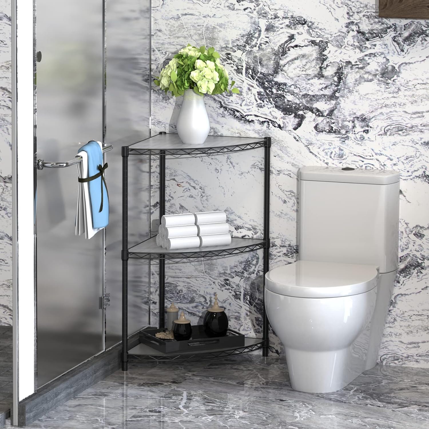 - SUITABLE FOR CORNER INSTALLATION: The triangular design of this storage rack makes it particularly suitable for corner placement, optimizing storage in spaces where room is limited but a large storage capacity is needed. Its simple, modern design ensures it can integrate seamlessly with any home or store decor style, making it appropriate for use in bathrooms, entryways, garages, kitchens, laundry rooms, offices, or closets.