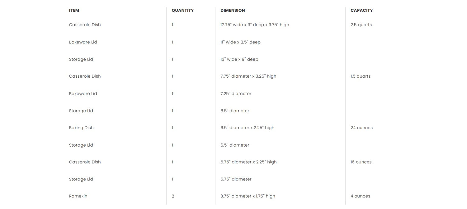 • 12-PIECE: Includes (1) 2.5-qt oval casserole with glass and plastic lids, (1) 1.5-qt round casserole with glass and plastic lids, (1) 16-oz round casserole with plastic lid, (1) 24-oz round casserole with plastic lid, and (2) 4-oz ramekins.