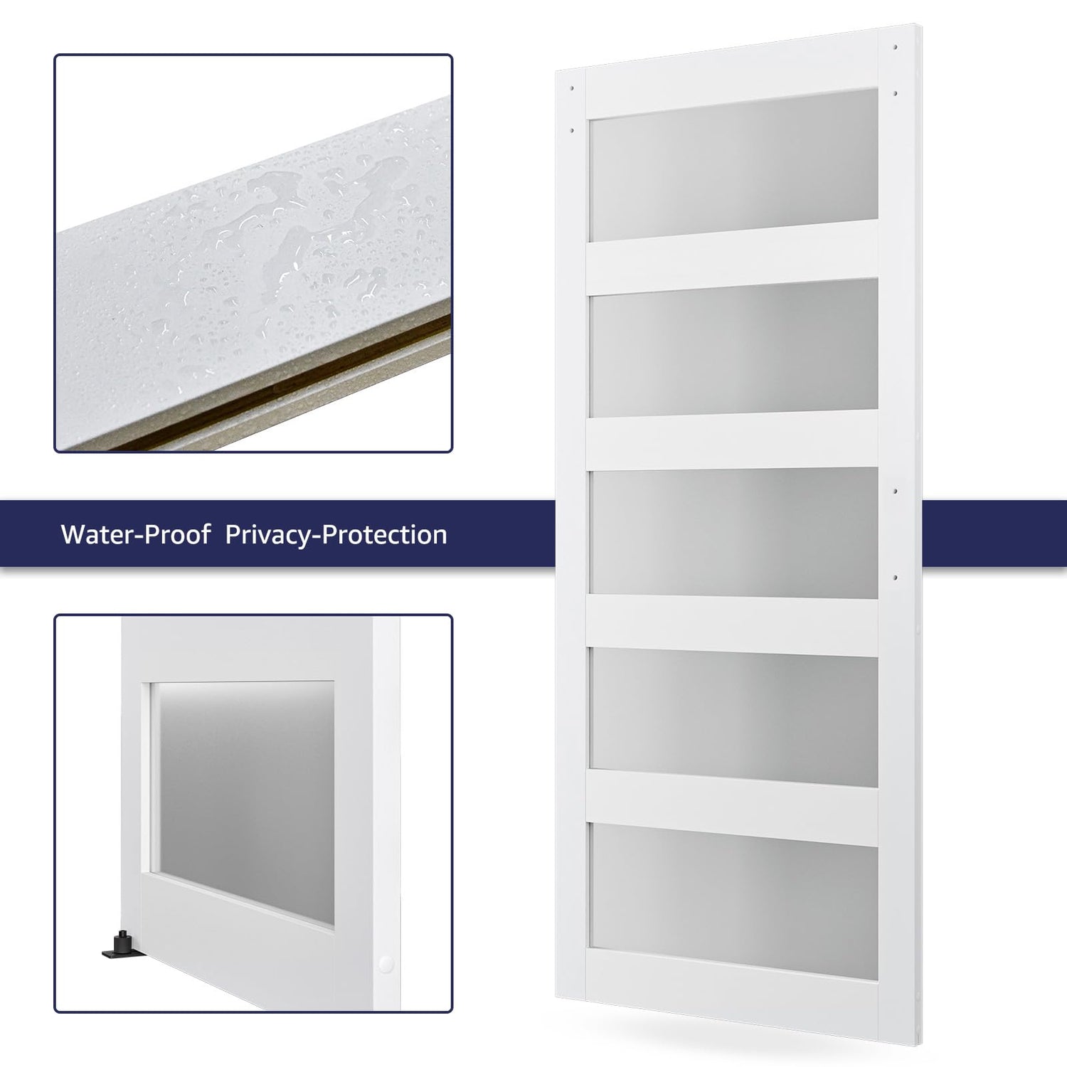 - Material Description: COSHOMER barn door is made of MDF and frosted glass. The thickness of the door is 1 3/8 inch. It is waterproof, scratch-resistant, and protects privacy, and especially for families with pets. The front of the door is the same as the back.
