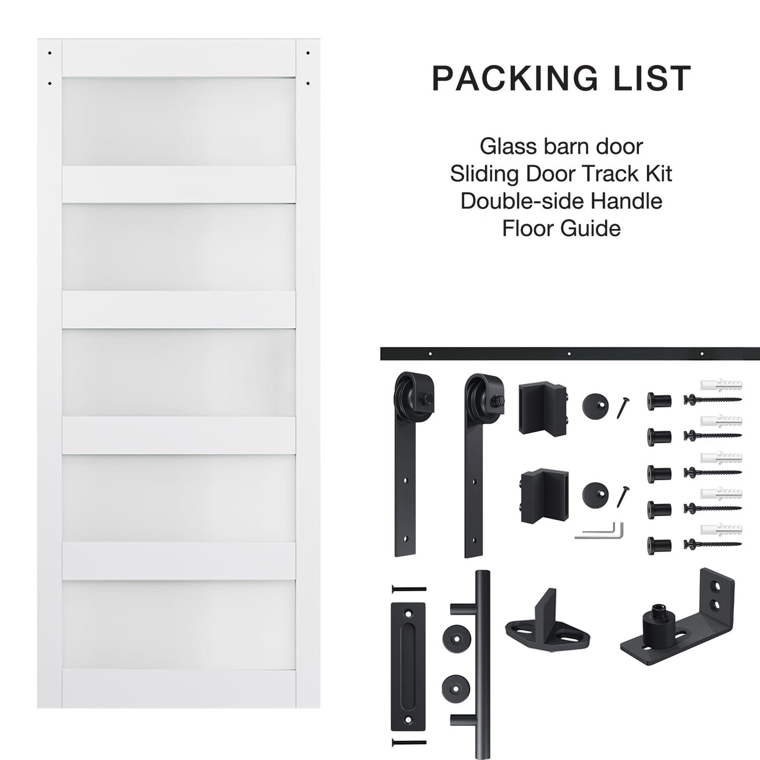 - Packing List: Our package includes barn door slats, barn door track, 5 frosted glass, two-sided handle, 2 kinds of floor guide(one for wall and the other for floor), and installation tools, detailed instruction. If you encounter any problems when you receive or use the product, please feel free to contact us.