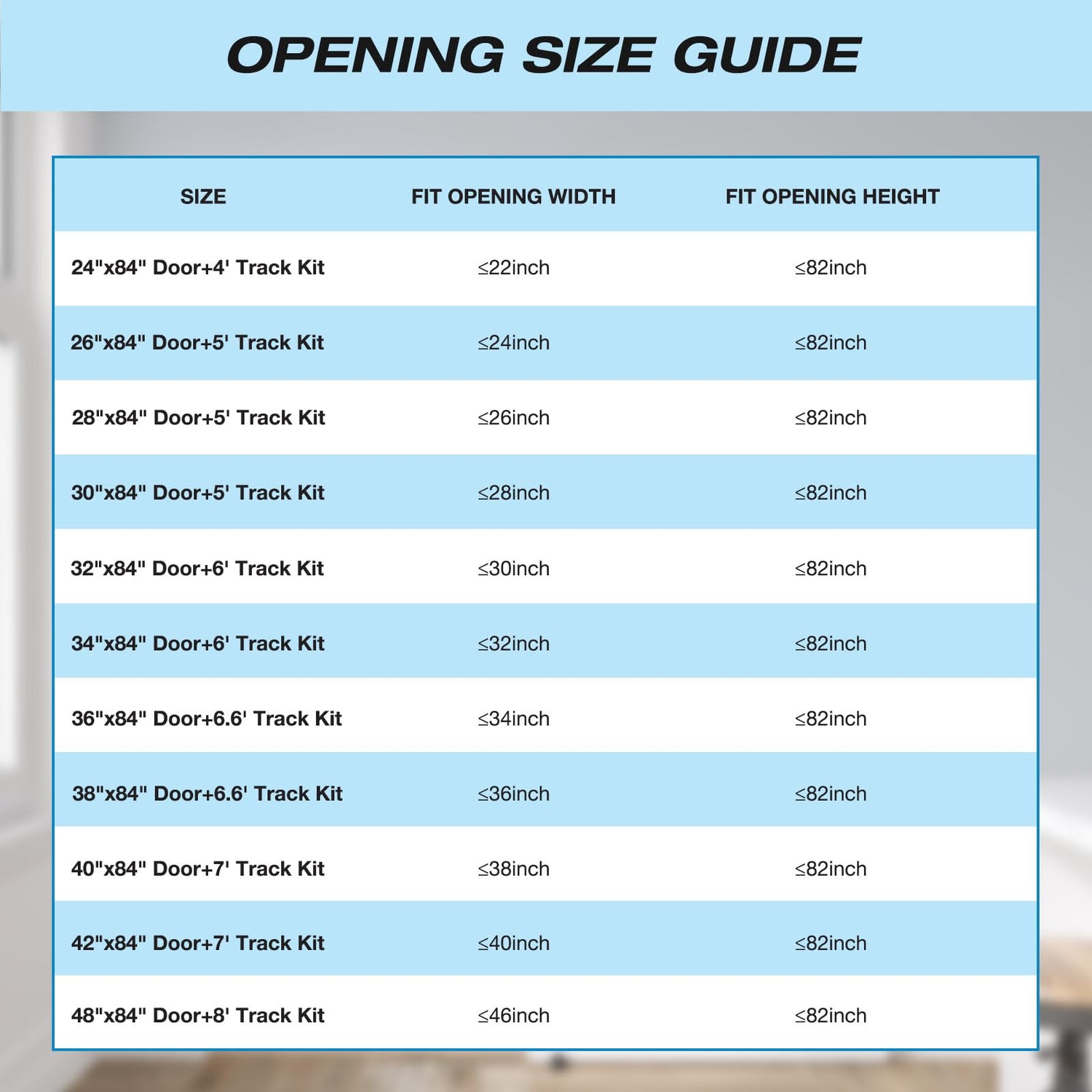 - Opening Size Guide: The maximum opening size of the barn door is the width of the barn door minus 2 inch and the heigth of the barn door minus 2 inch. For example, the 36" x 84" door, the maximum width of the opening size is 34 inch and the maximum heigth of the opening size is 82 inch.