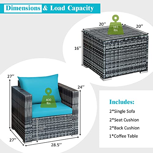 COSTWAY 3 PC Patio Rattan Furniture Bistro Set Cushioned Sofa Chair Turquoise
