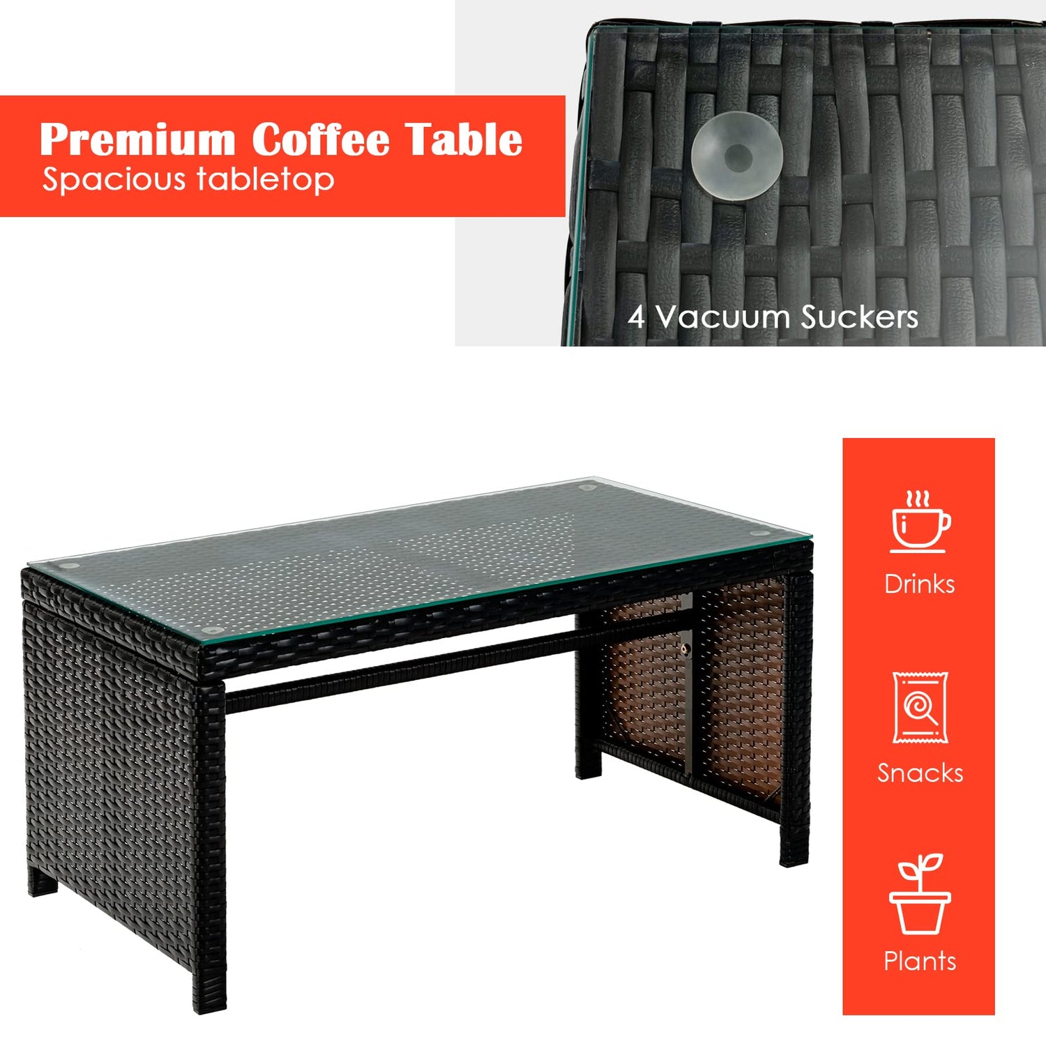 Our four-piece rattan sets brighten up your living space while providing a comfortable seat. Crafted with premium rattan, each piece creates a cool and textured appearance, which perfectly matches your outdoor or indoor space. In addition, rattan features the advantage of weather resistance to creating excellent user experience. The tempered glass coffee table comes with four suckers, which provide superior durability while bringing convenience. The high resilience foam seat adds softness dedicated to supporting and relaxing your hips. This outdoor furniture set includes 1 loveseat, 2 single chairs and 1 coffee table that can be freely combined based on your favorite.