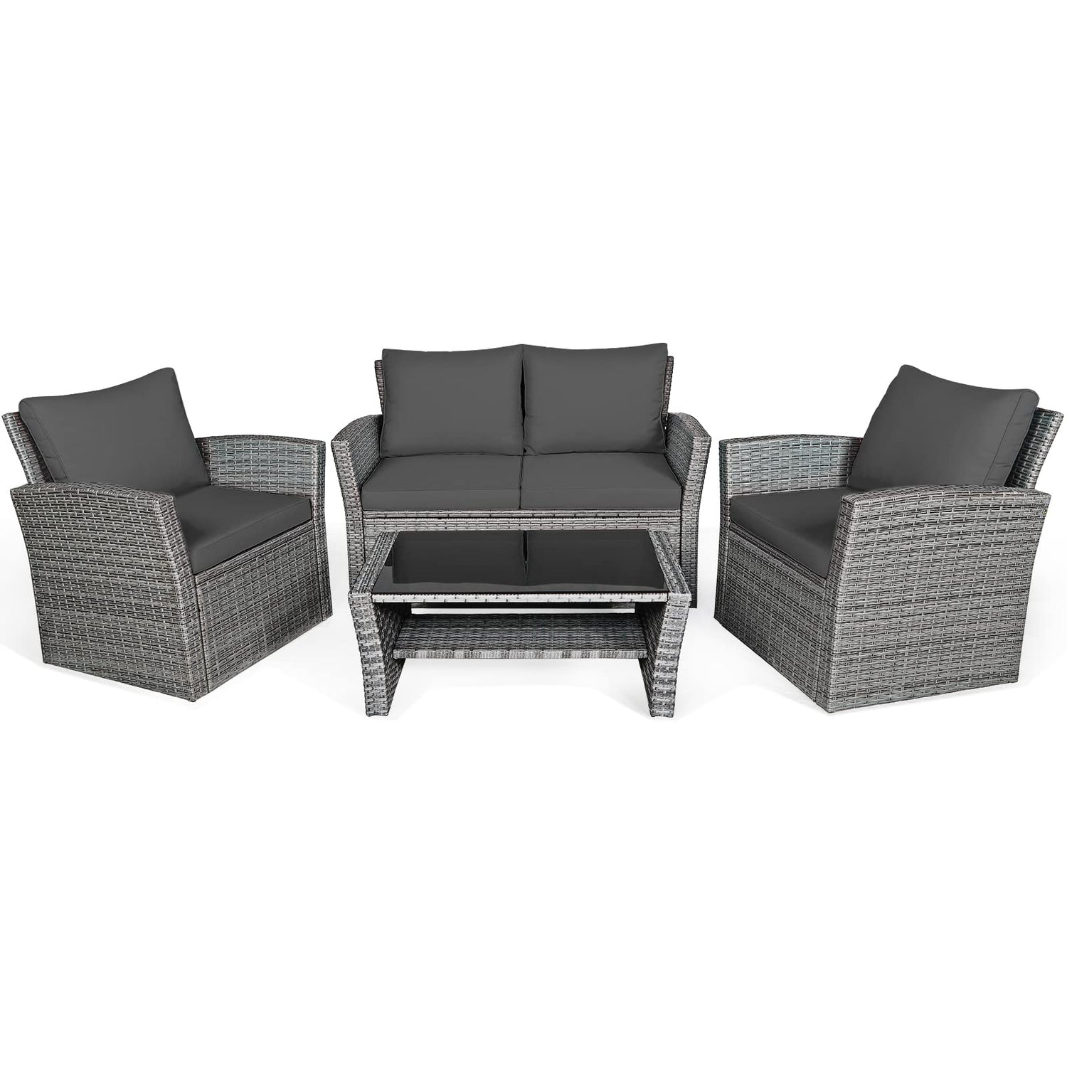 COSTWAY 4 Pieces Patio Rattan Furniture Set, Outdoor Wicker Sofa Set with Tempered Glass Coffee Table, Cushions, All Weather Rattan Conversation Set for Yard Balcony Backyard Pool, Grey