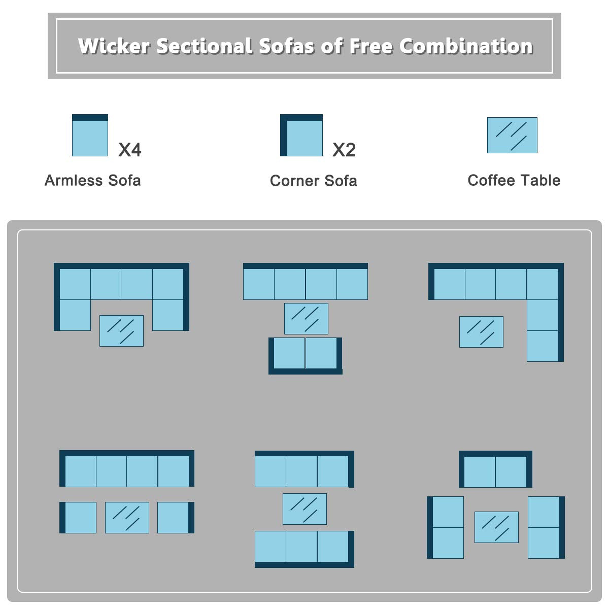 - Versatile Sectional Sofa Set: The free combination of 2 corner sofas, 4 armless sofas and a coffee table allows you to change the position according to your different needs. With stylish appearance and clean lines, this 7-piece outdoor furniture set will be a perfect addition to your indoor and outdoor places.