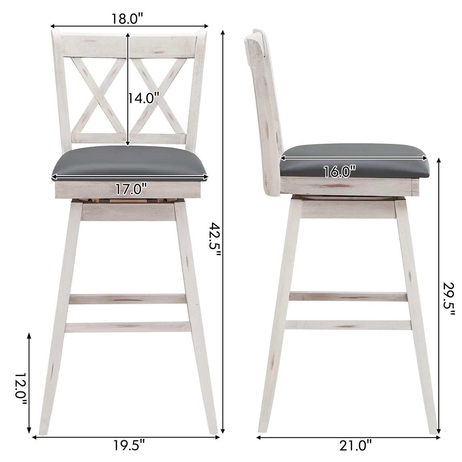 COSTWAY Bar Stool Set of 2, 360° Swivel Bar Height 29.5 inch Bar Stool with Foot Rest Upholstered Cushion & Ergonomic Backrest, Sturdy Frame, for Pub, Restaurant, Home (2, Antique White+ Grey)