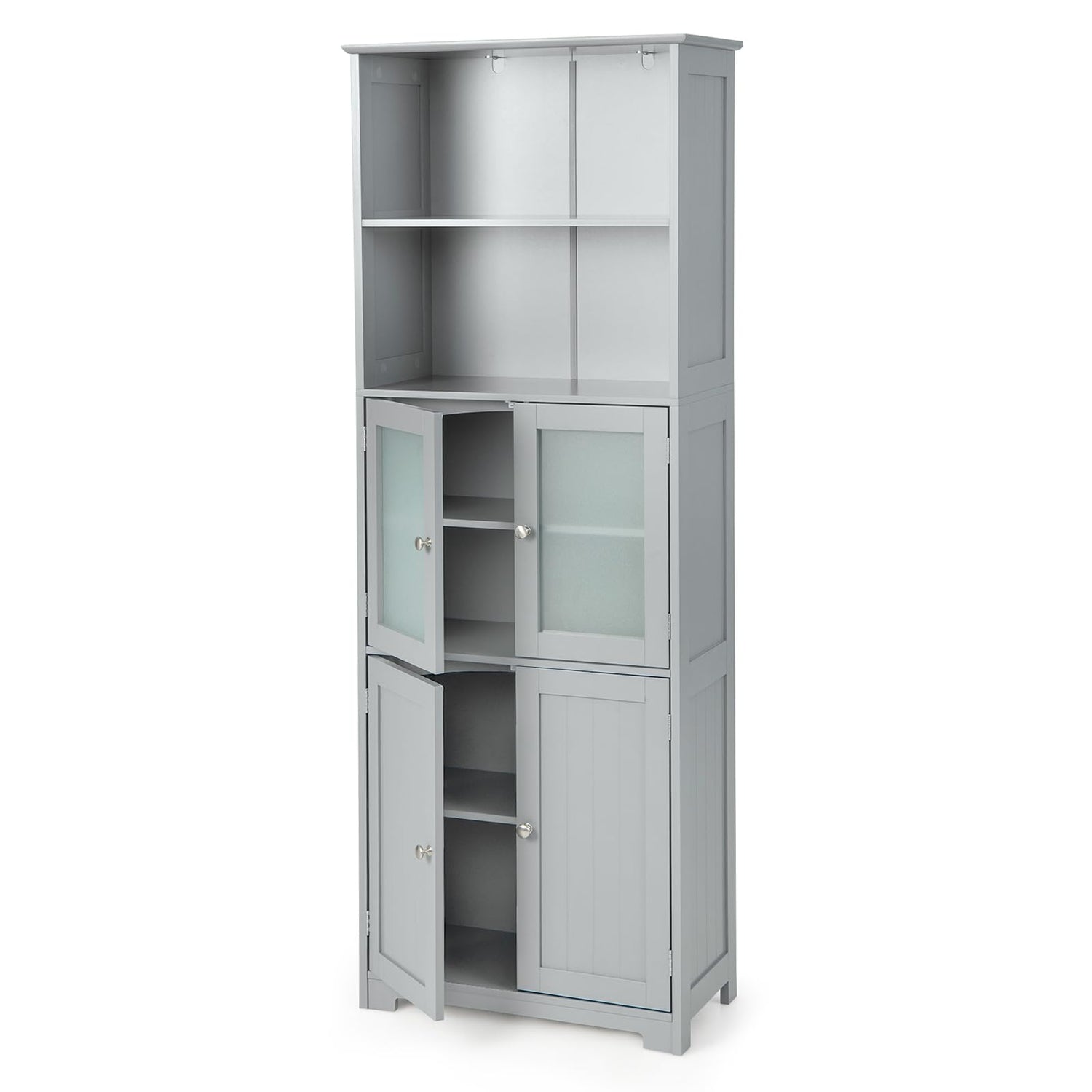 COSTWAY 64” Grey Freestanding Bathroom Storage Cabinet with Glass Doors and Adjustable Shelves