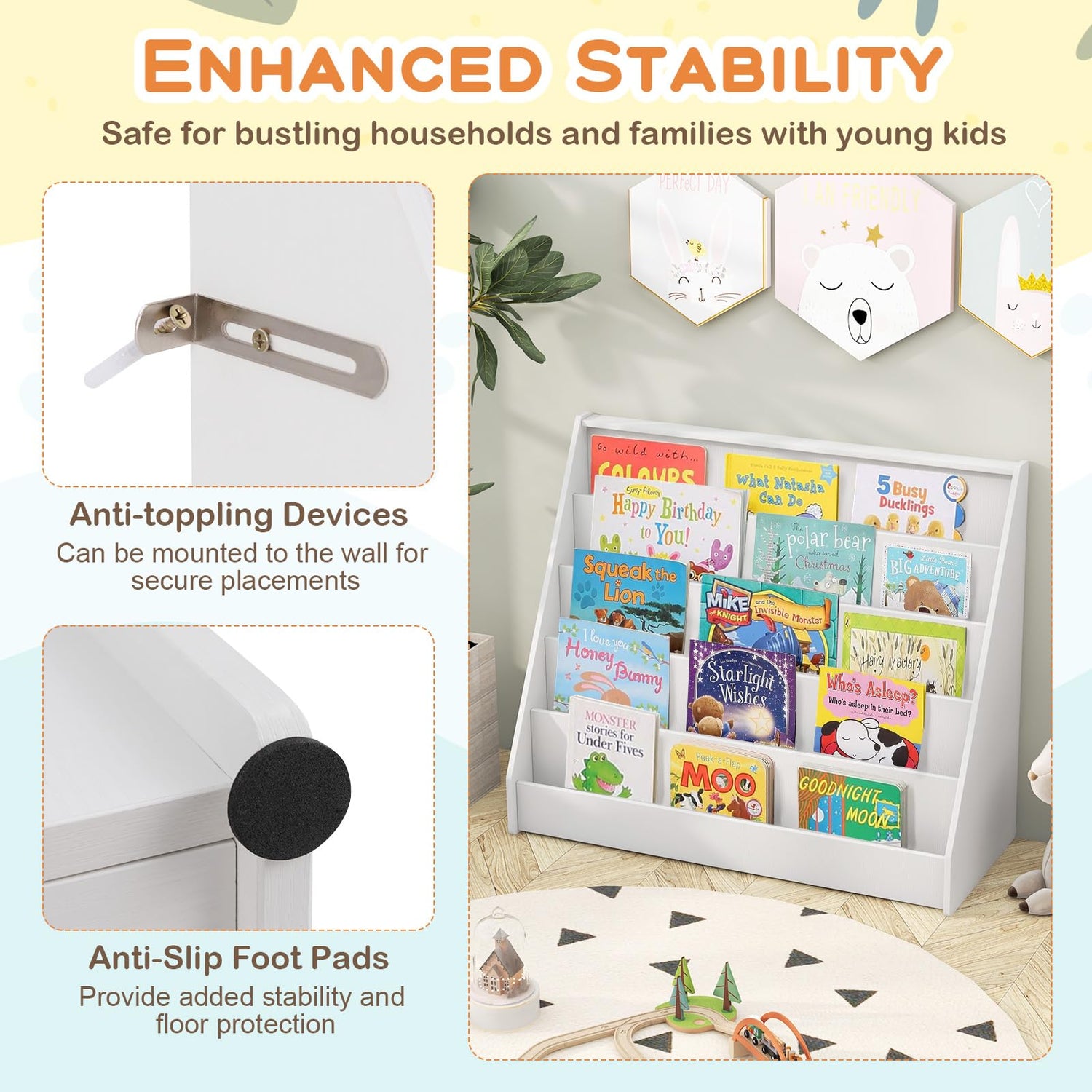 Costzon 5-Tier Kids Bookshelf, Wooden Children Bookcase, Toddler Book Rack, Magazine Storage & Display Shelf, Book Shelf for Kids Room, Living Room, Nursery, Classroom (White)
