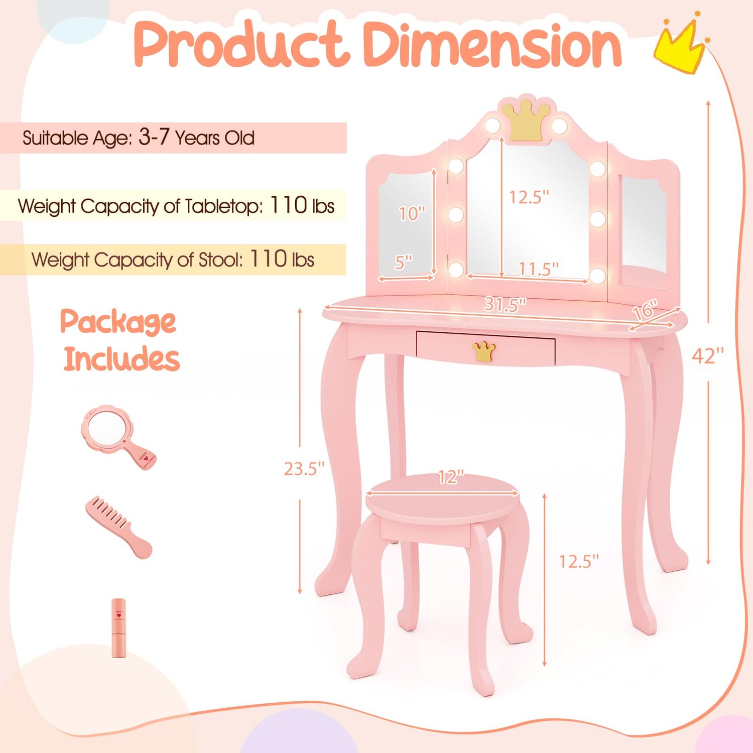 Costzon Kids Vanity with Lights, Girls Vanity Set with Mirror and Stool, Drawer, 2 in 1 Princess Makeup Desk Dressing Table, Toddler Vanity, Pretend Play Kids Vanity Table and Chair Set (Pink)