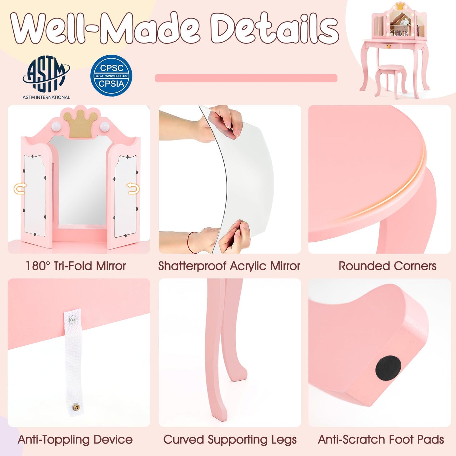 The adjustable lighting options provide a realistic grooming experience, offering warm yellow, cool white, or warm white lighting color. With ample storage space and safety features like an anti-toppling device and a shatterproof mirror, this kids vanity desk set encourages organization and ensures peace of mind. The stylish design with crown-shaped decorations and a tri-fold mirror makes it a delightful addition to any child's room and a perfect gift idea.