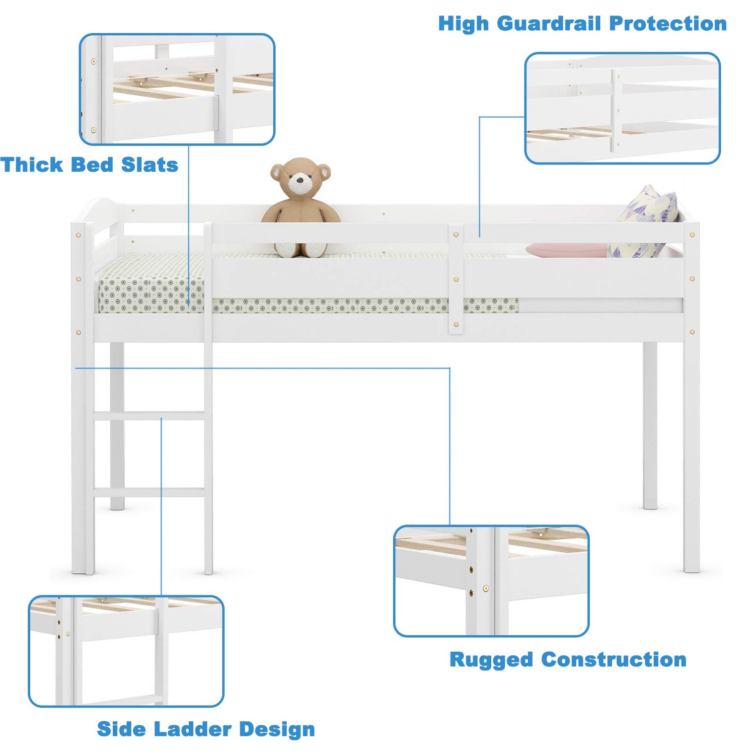 Costzon Twin Loft Bed, Solid Wood Low Loft Bed w/Guard Rail and Ladder, Boys & Girls Twin Bed for Kids Room, No Box Spring Needed, Classic Children Low Loft Bed with Storage for Bedroom, White