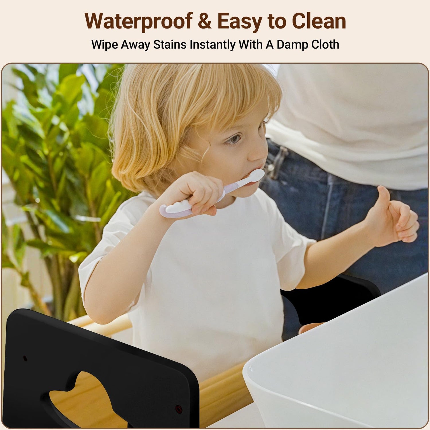 - Anti-Slip Strips Included: Six clear non-slip strips are placed on the step and stand of this toddler helper tower,which ensures and keeps little feet in the right place. With this design, even if water spills on it, you won’t have to worry about your child slipping.