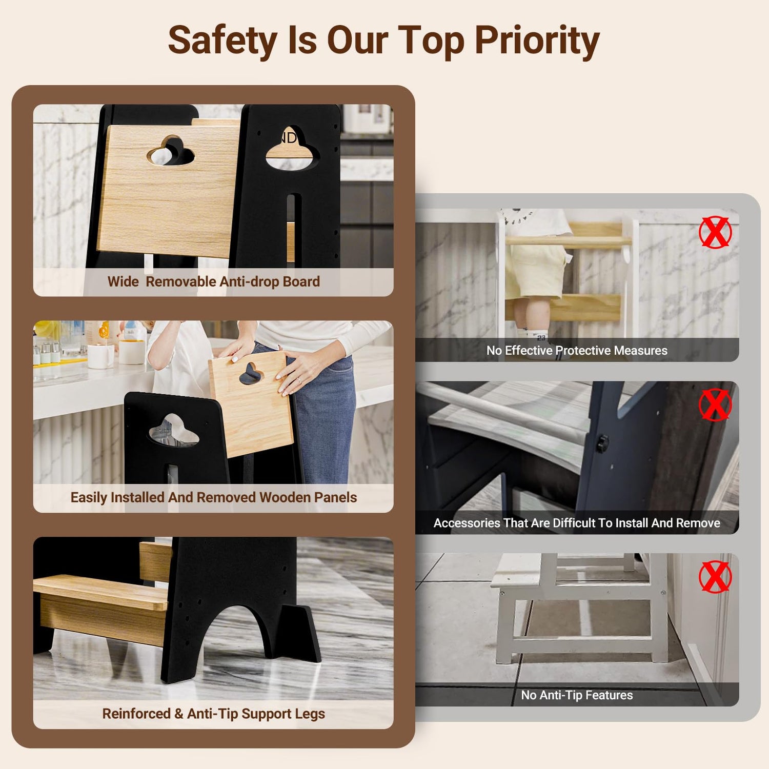 - Wide Anti-Drop Board: This kitchen tower for learning comes with a wide, removable anti-drop board designed to prevent falls. It can be easily removed and installed, allowing kids aged three and up to operate it on their own. You can feel confident letting your little ones play and learn kitchen skills safely on it.