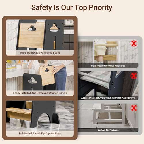 - Wide Anti-Drop Board: This kitchen tower for learning comes with a wide, removable anti-drop board designed to prevent falls. It can be easily removed and installed, allowing kids aged three and up to operate it on their own. You can feel confident letting your little ones play and learn kitchen skills safely on it.