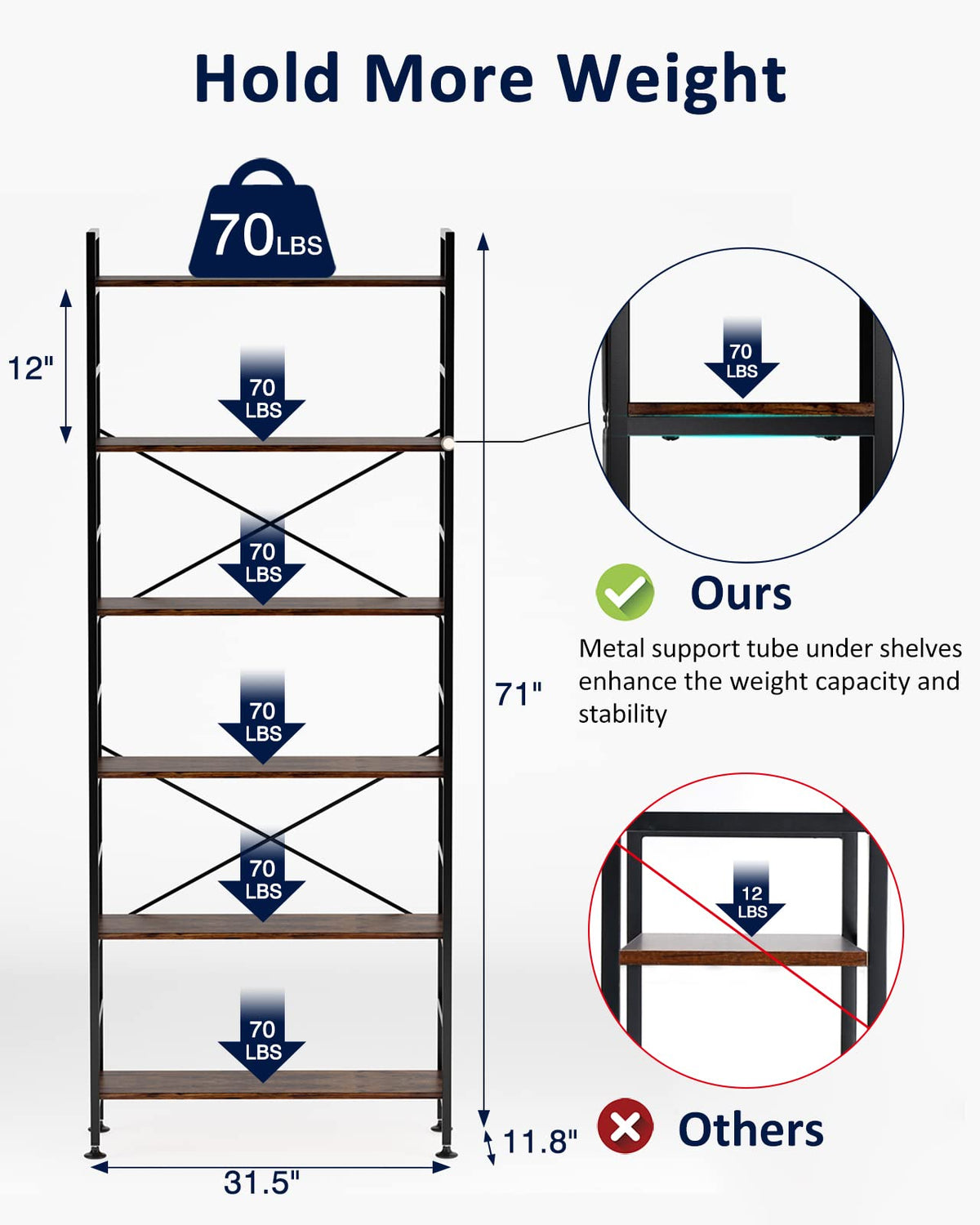 - 【Hold More Weight】 Unlike general bookshelves that can only hold 20-30 lbs per shelf, we've added extra metal support tubes under each shelf to increase the weight capacity to a whopping 70 lbs per shelf. Store more without the fear of shelf breaking.
