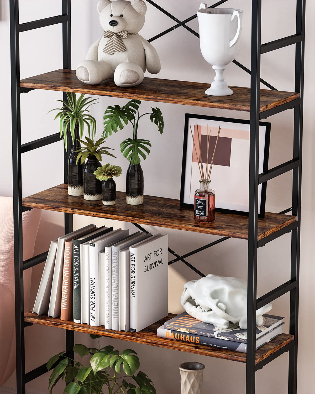 - 【Stable】 Features a solid frame reinforced by X-bracing bars, balanced by adjustable feet, and secured by a wall attachment kit, ensuring that your display items and this bookshelf stay securely in place. No more worrying about wobbly shelves or tip-overs.