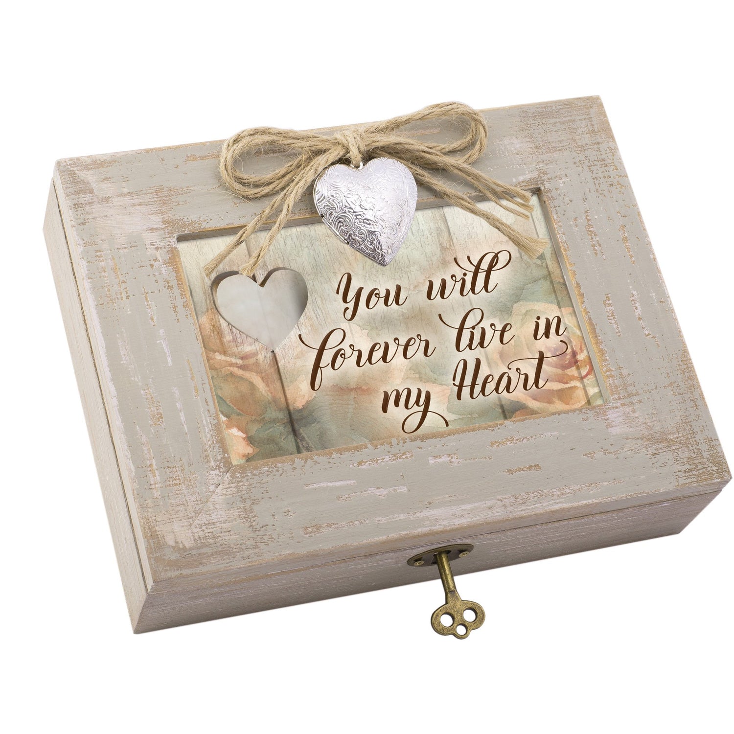 Details: Handcrafted wood with distressed paint finish; Made of solid wood. Jewelry box measures approximately 8.5 x 6.5 x 2.25 inches; Replace artwork with 4 x 6 inch personal photo. Traditional wind-up mechanism engages music to play melodic tune Edelweiss. Insert photo in functional metal locket; Vintage turn-key lock design to secure your little treasures and keepsakes. Ships in protective packaging; Ready for giving to that special someone.