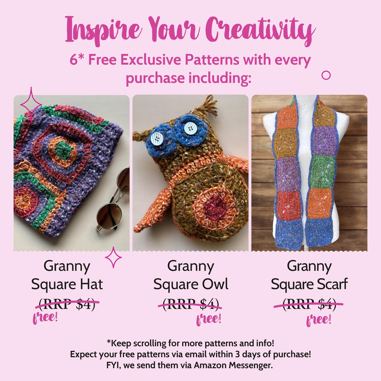 - FREE PATTERNS WITH PURCHASE: Includes 6 granny square–style crochet patterns—perfect for wearables, gifts, and textured projects. Emailed within 3 days so you can start your project right away. Didn’t get them? Just reach out! Preview pattern details on the product page.