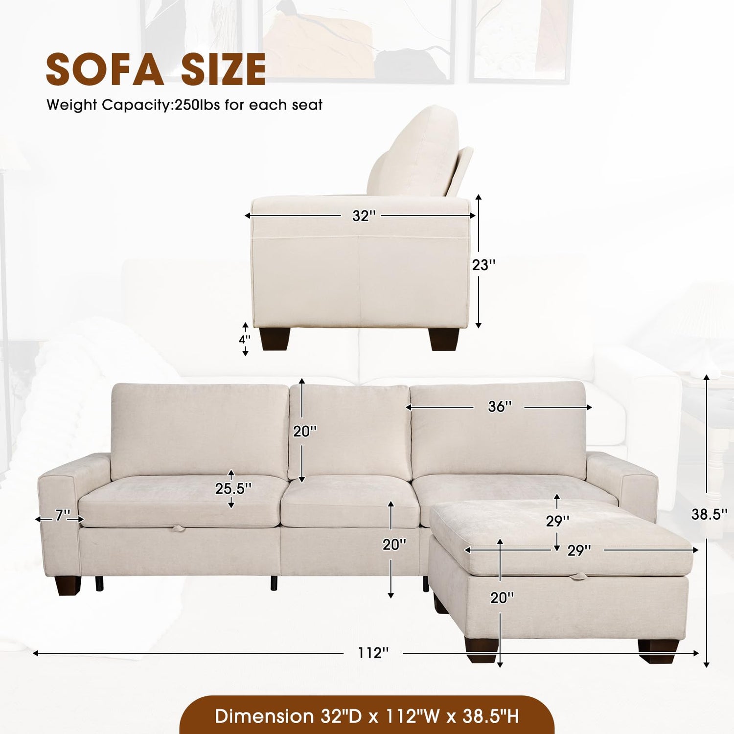 Couchus 112“ Convertible Storage Sectional Sofa,L Shaped Couch with Storage Ottoman,Multi-Functional Reversible Sofa with Huge Storage Space, Breathable Fabric (Beige)