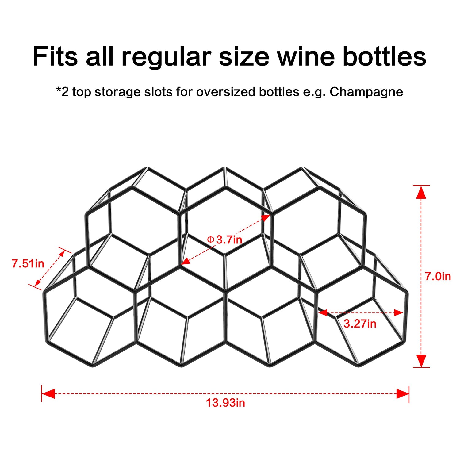 - FREE STANDING METAL WINE RACK -This metal wine rack could holds 9 bottles, Distinctive black color and geometric design make this wine rack worthy of being on display in the kitchen, dining room or bar area.