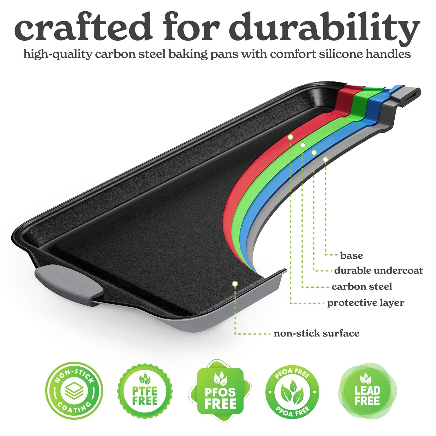 - Silicone Handles: Our bakeware sets non toxic are designed with safety in mind. The silicone handles ensure a secure grip, allowing you to easily and safely move your nonstick baking sheets in and out of the oven.