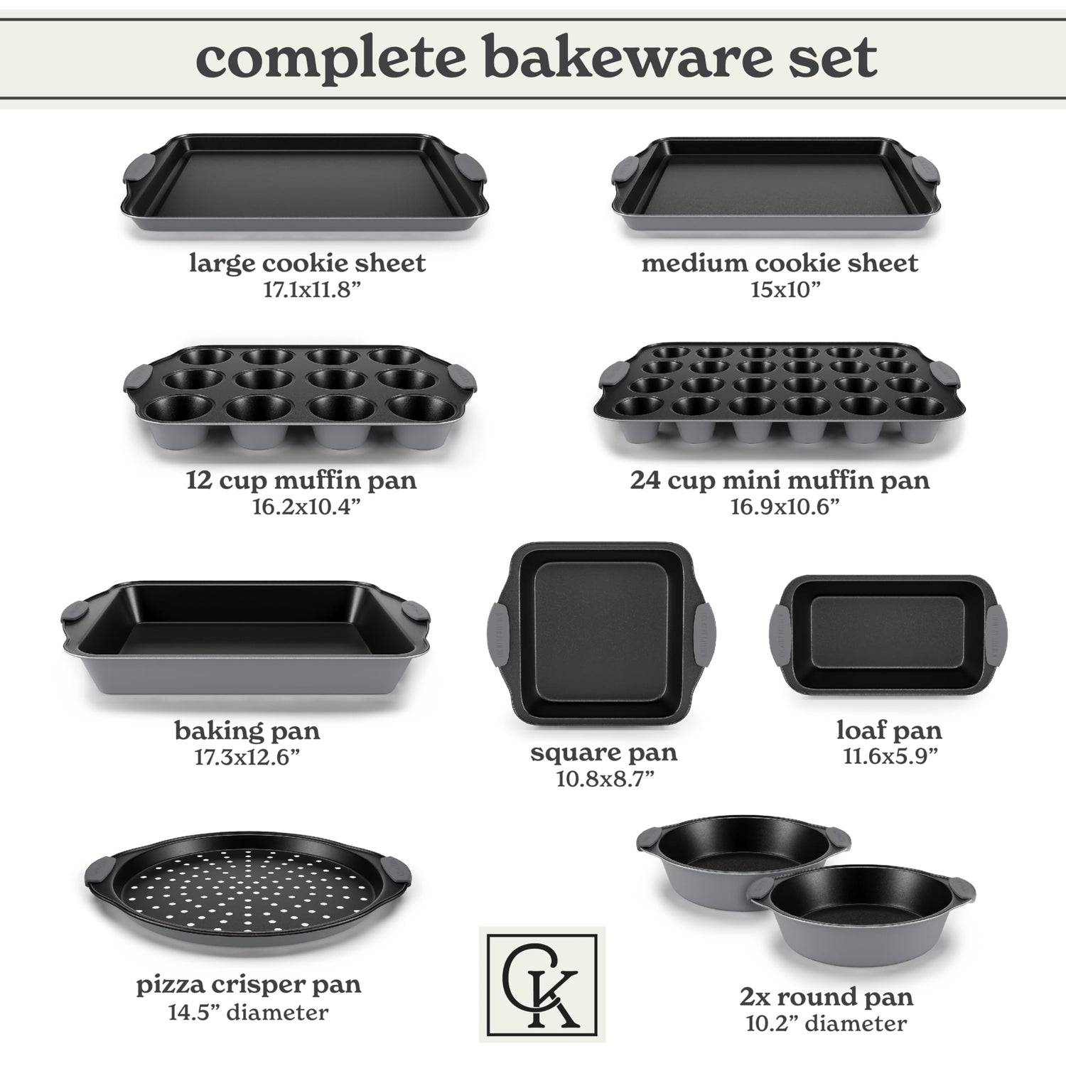 - 10 Piece Baking Set: This space saving beginner baking set includes a variety of pans, perfect for all your baking needs. It includes a non stick cookie sheet, a large and small baking pan, and more.