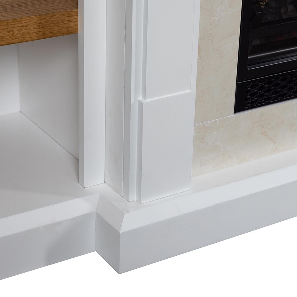 - REVERSABLE MARBLE or WHITE TRIM: The mantel package’s firebox trim is reversible, allowing for a tan faux marble look or a solid white look, whichever best complements your décor.