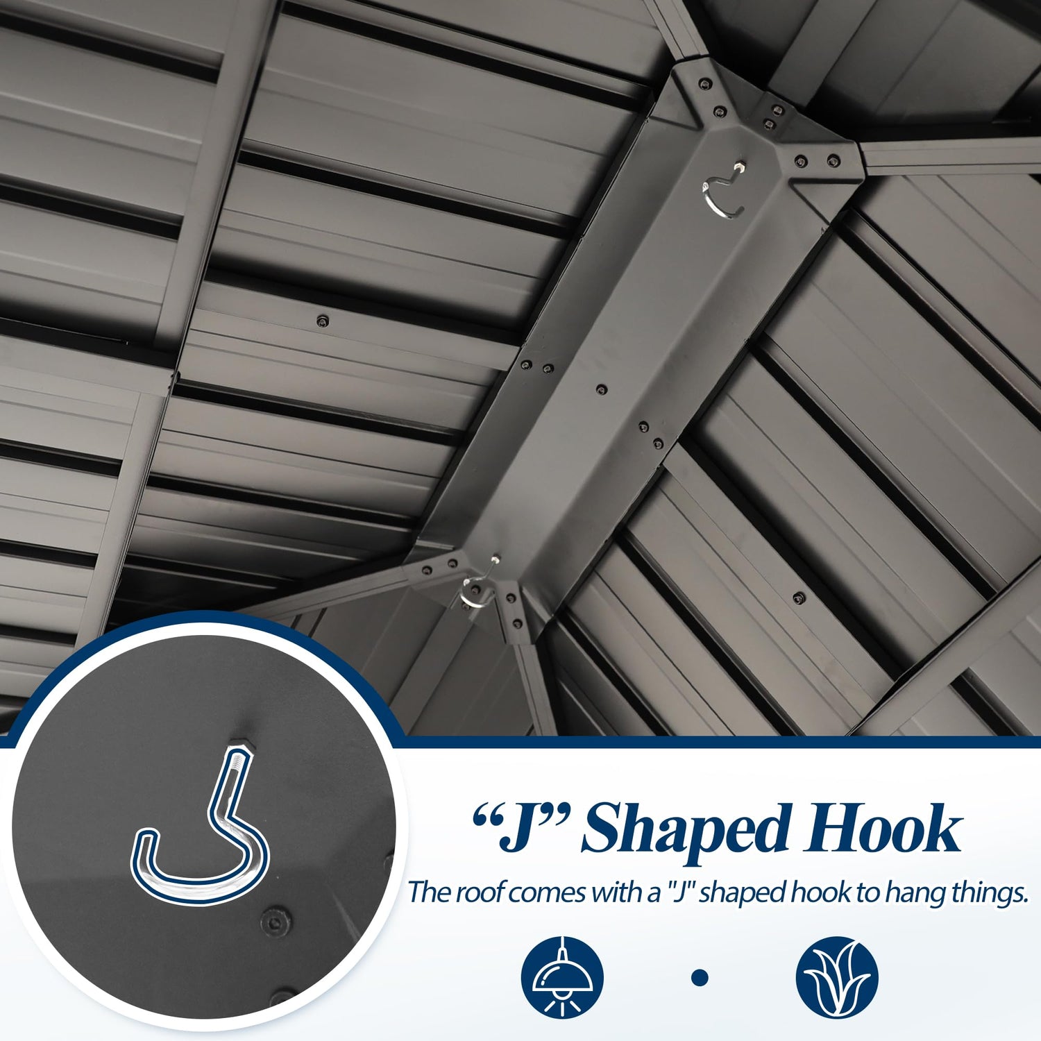 - CONVENIENT DESIGN: The outdoor heavy-duty gazebo equipped with double track with hooks, which can be used to hang netting and curtains (NOT INCLUDED), which can be adjusted by sliding the hooks on the track. The J-shaped hooks in the middle of the roof can be used to hang lights and decorations.