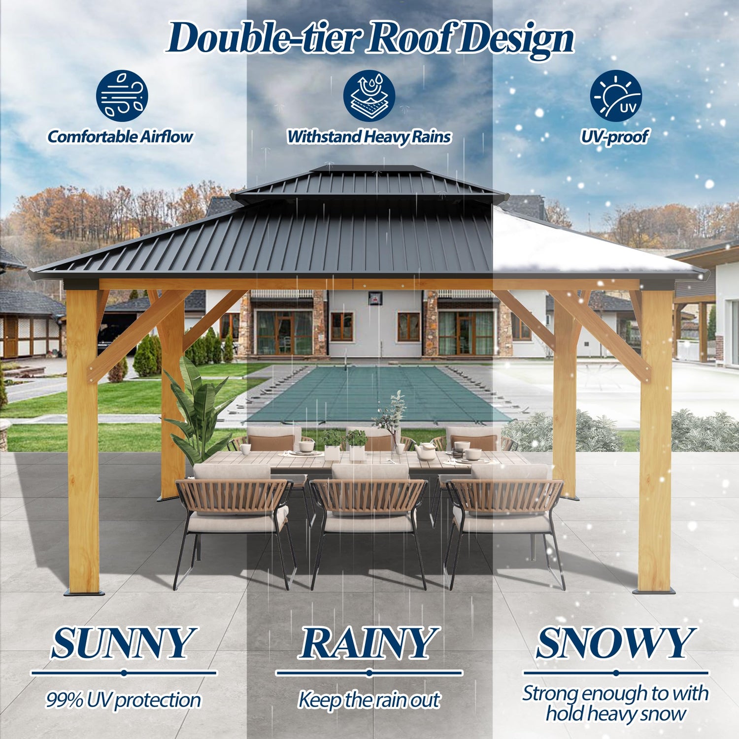 - VARIOUS SCENES: Our patio galvanized steel hardtop gazebo with double roof creates an extra place for providing shade and protection. The outdoor double roof gazebo is suitable for your backyard, lawn, deck, garden, patio & poolside. The outdoor wood frame gazebo provides a great playing space for you to have party, gathering, resting, etc. during your leisure time.