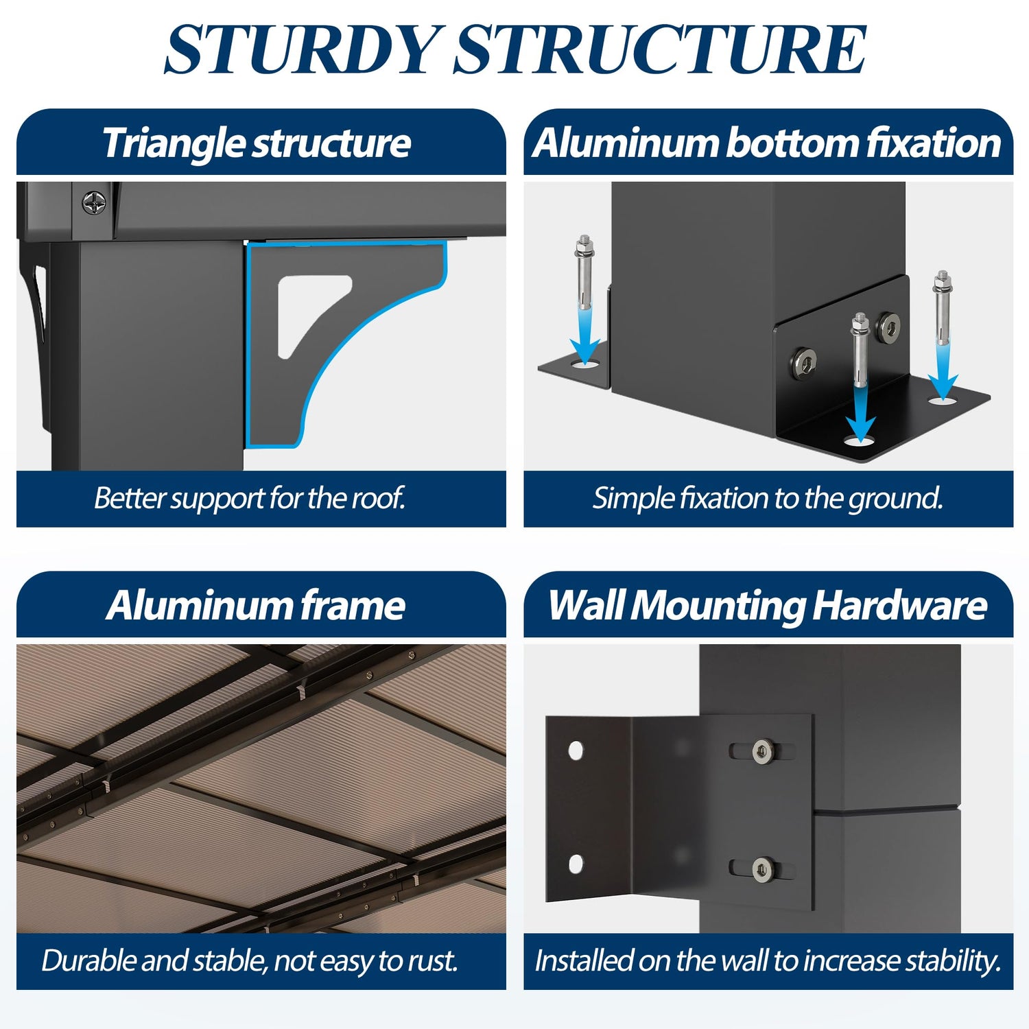 - 🎁REINFORCED ALUMINUM FRAME: Outdoor polycarbonate lean to gazebo constructs with powder coated aluminum frame, which is sturdy, anti-corrosion and all weather resistant that stable enough can withstand heavy snow and wind for years of use. The patio hardtop gazebo with aluminum frame has reinforced wall-mounting hardware to provide extra durability and safety for attaching.