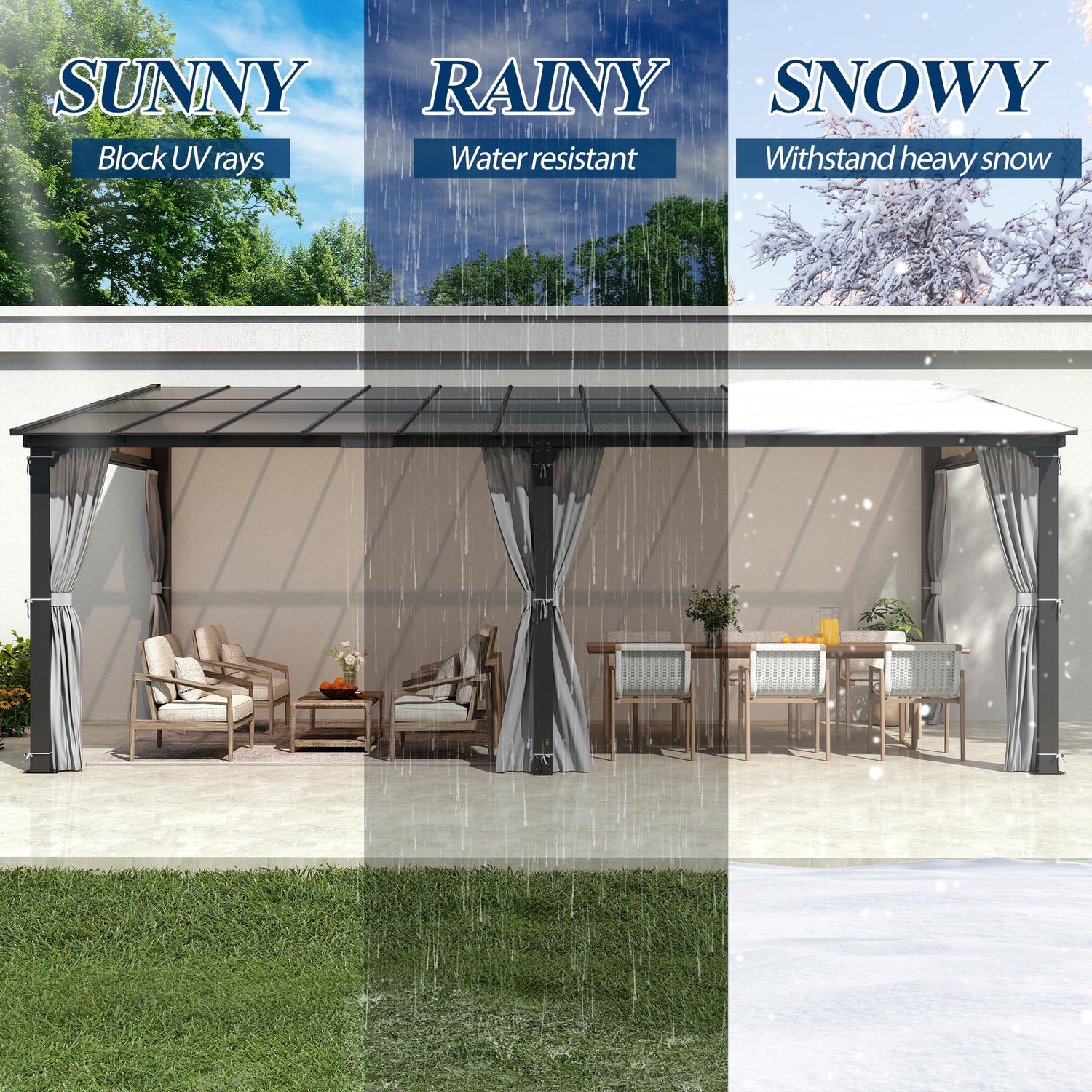 COVERONICS 12' X 20' Outdoor Polycarbonate Lean to Gazebo - Wall-Mounted Aluminum Frame Gazebo with Slope Hardtop, Patio Heavy-Duty Lean to Pergola with Netting & Curtains for Garden, Backyard, Deck