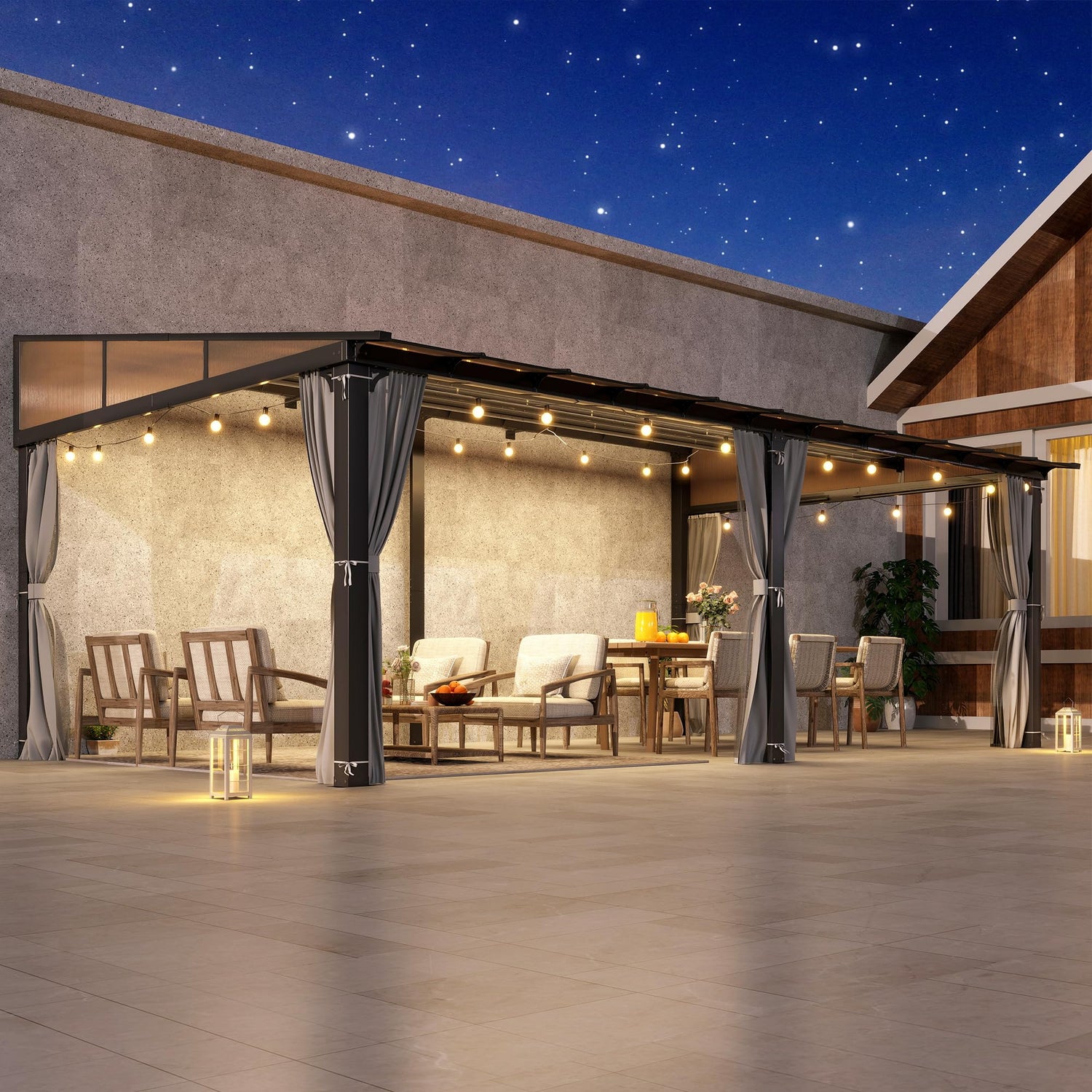 Details: Outdoor Polycarbonate Lean to Gazebo - Wall-Mounted Aluminum Frame Gazebo with Slope Hardtop, Patio Heavy-Duty Lean to Pergola with Netting & Curtains for Garden, Backyard, Deck