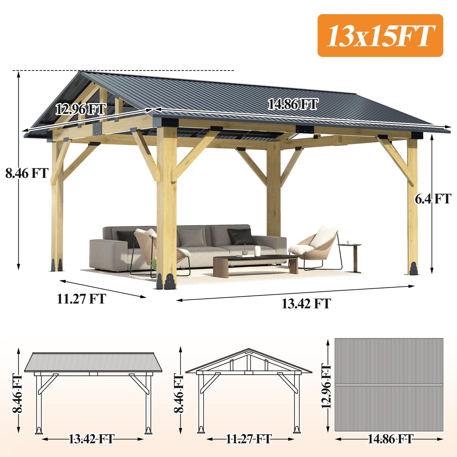 - [MULTIPLE APPLICATIONS]: Our patio gazebo is ideal for your patio, poolside, deck or seasonal campsite. Outdoor wood frame gazebos provide ample space for seating, dining or relaxing, also can be used for parties, businesses, and as carport parking, allowing you to make the most of your outdoor area. Our wood gazebo can be used all year round!