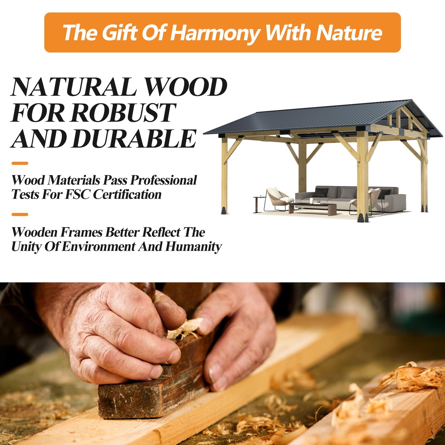 - [HIGH-QUALITY WOOD FRAME]:Our wooden gazebos are made from FSC certified quality wood frames to ensure the durability and stability of the hardtop gazebo. High-quality wood makes our outdoor gazebos stronger. In addition, we comply with FSC standards to maintain the ecological balance and biodiversity of our forests. We promote ecological sustainability when making this wooden frame gazebo.