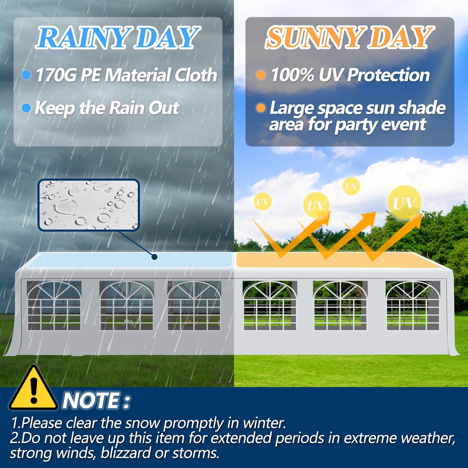- 【NOTE】Party tents should not be left up for long periods of time in extreme weather such as heavy rain, strong winds or storms as they can blow over. Please note that when a storm comes, the tent should be stowed away to prevent it from being blown away. In winter, you need to remove the snow from the tarp in time to prevent the tent from collapsing.