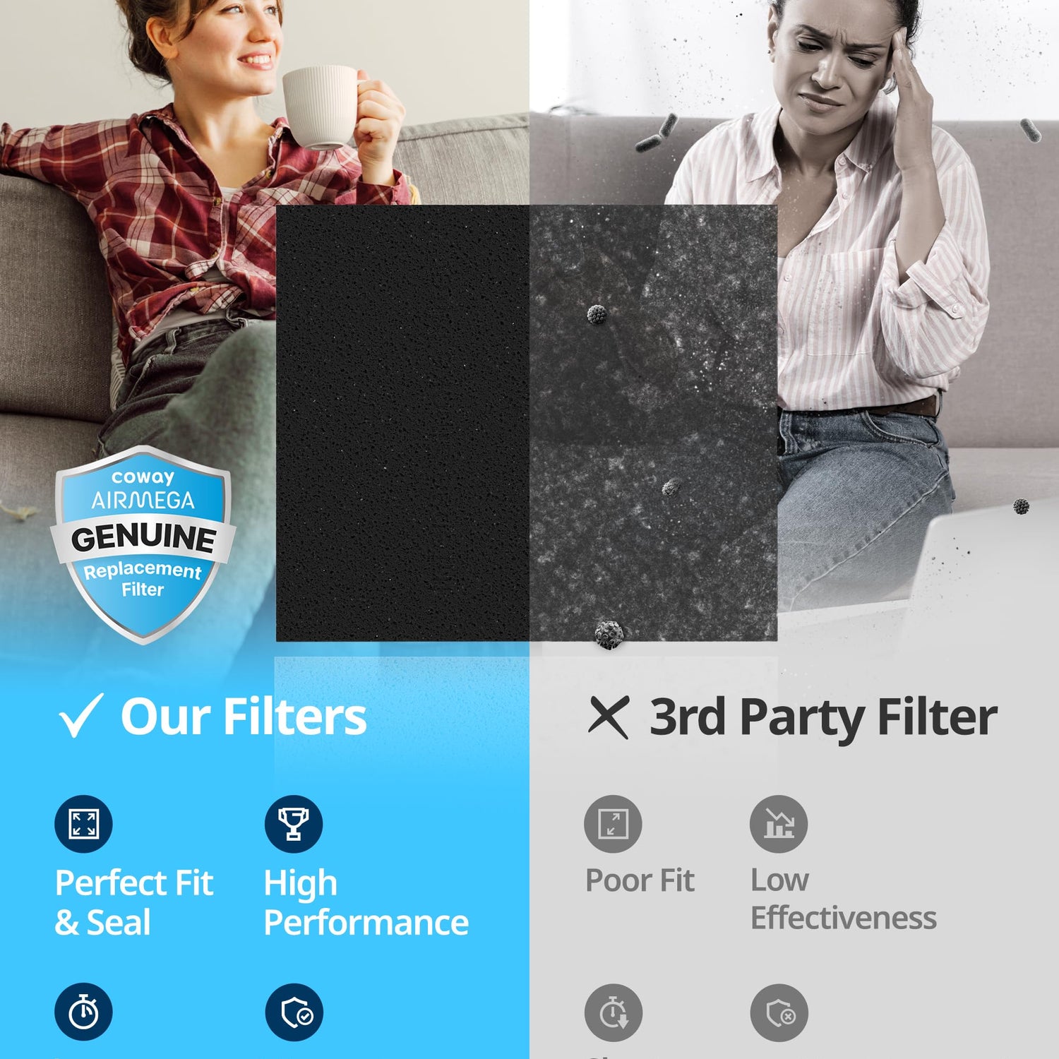 Details: Coway Airmega AP-1512HH Filter Set includes 1 HEPA filter and 2 carbon filters for odor control. The True HEPA filtration system is designed to capture 99.97% of airborne allergens as small as 0.3 microns in size, while the odor-eliminating carbon filters are designed to eliminate odors and gases from the air.