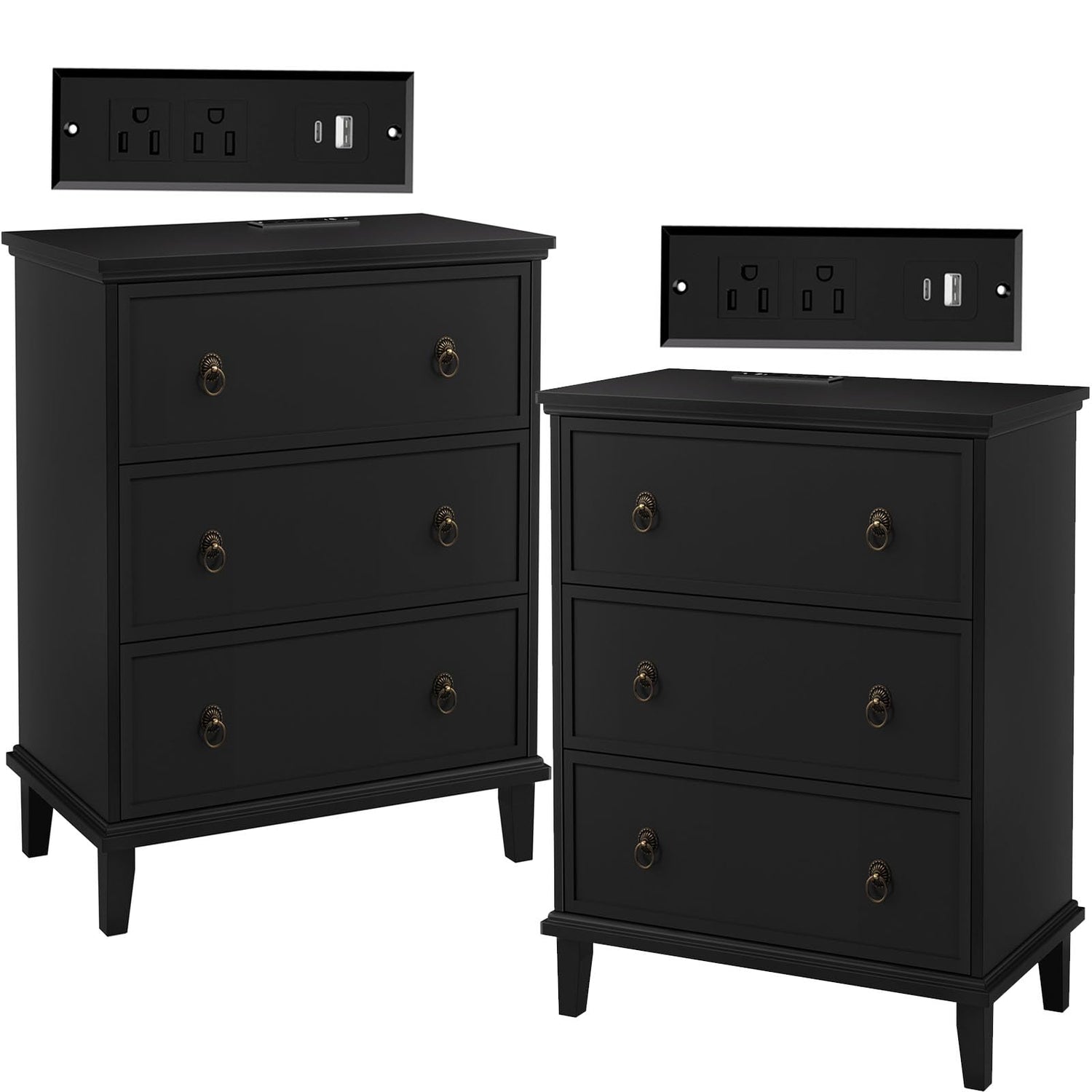COWMOU 27.6 Inch Wide Nightstand Set of 2 with Charging Station, 3 Drawers Nightstand for Bedroom, Wooden Black Large Bedside End Table for Living Room, Bedroom, Study, Office