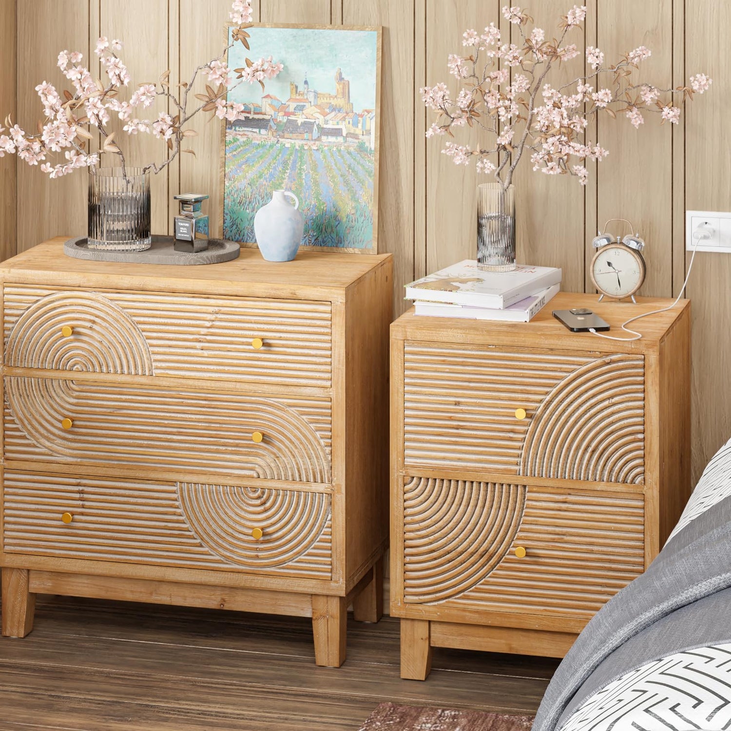 - Stylish Yet Functional: The rustic wooden nightstand with ring pattern effortlessly adapts to living room, bedroom, entryway or any corner. The storage capacity of the 3-drawer dresser can meet daily needs perfectly.