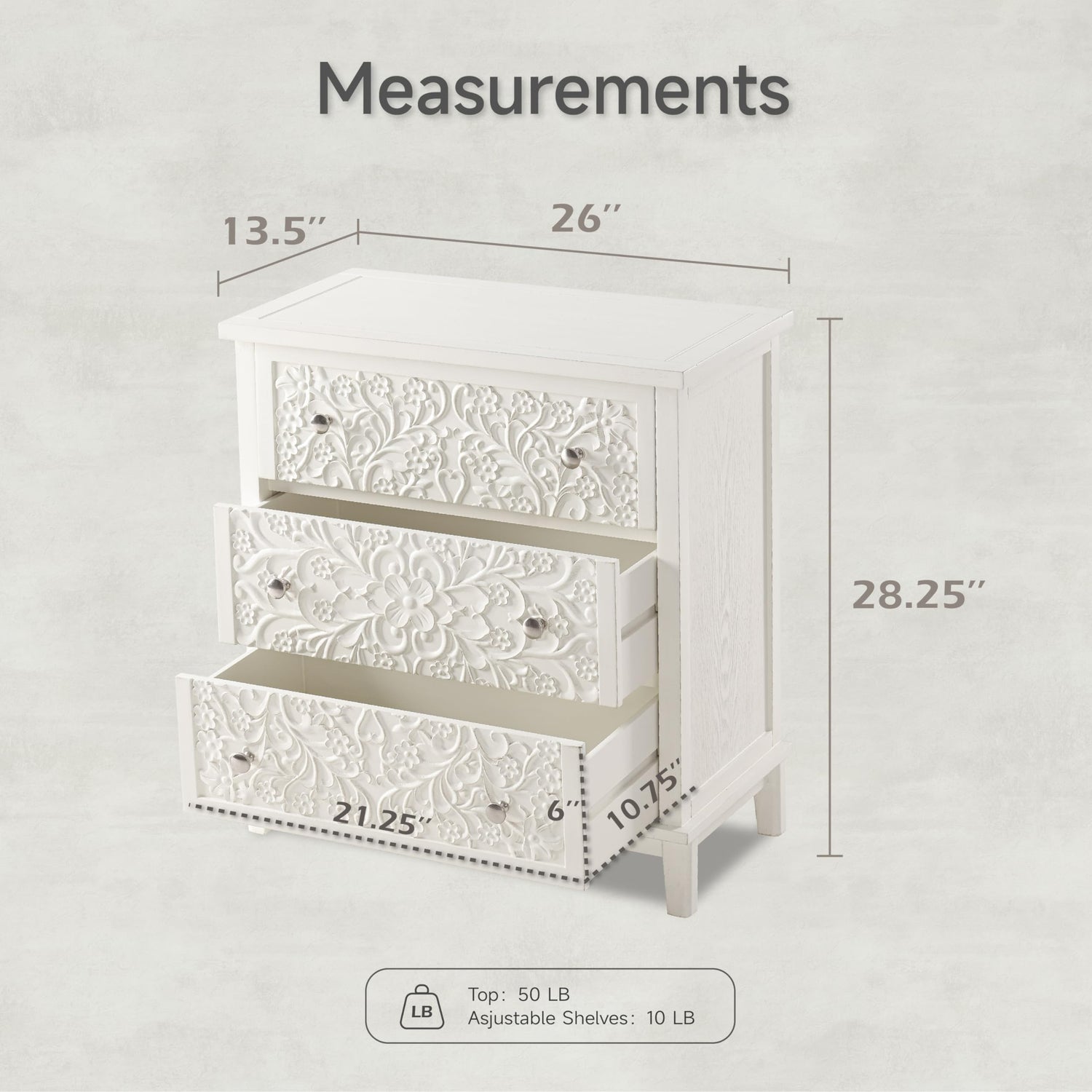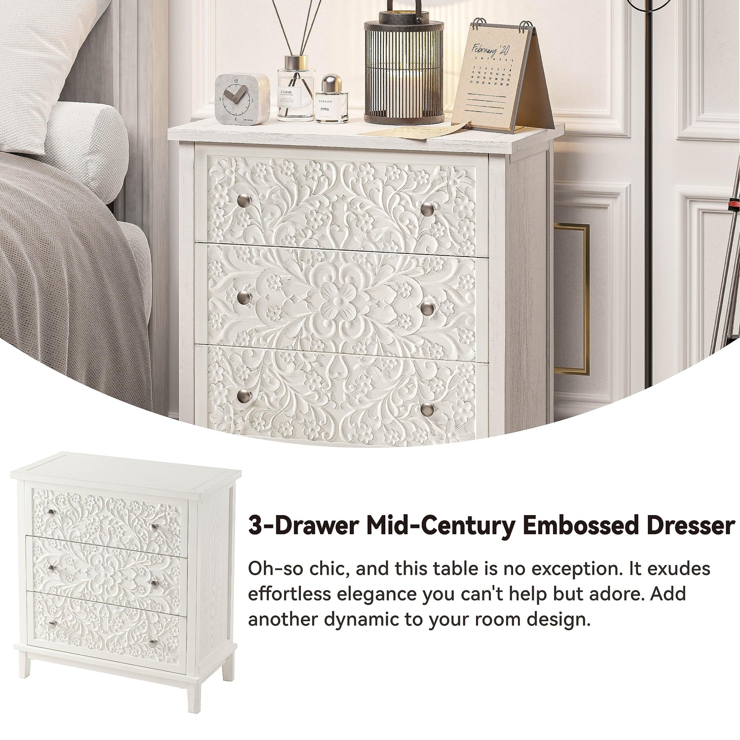 COZAYH 3-Drawer Fully-Assembled Flower Motif Dresser for French Country, Farmhouse, Modern, Rustic Style, Distressed Finish, White-Washed