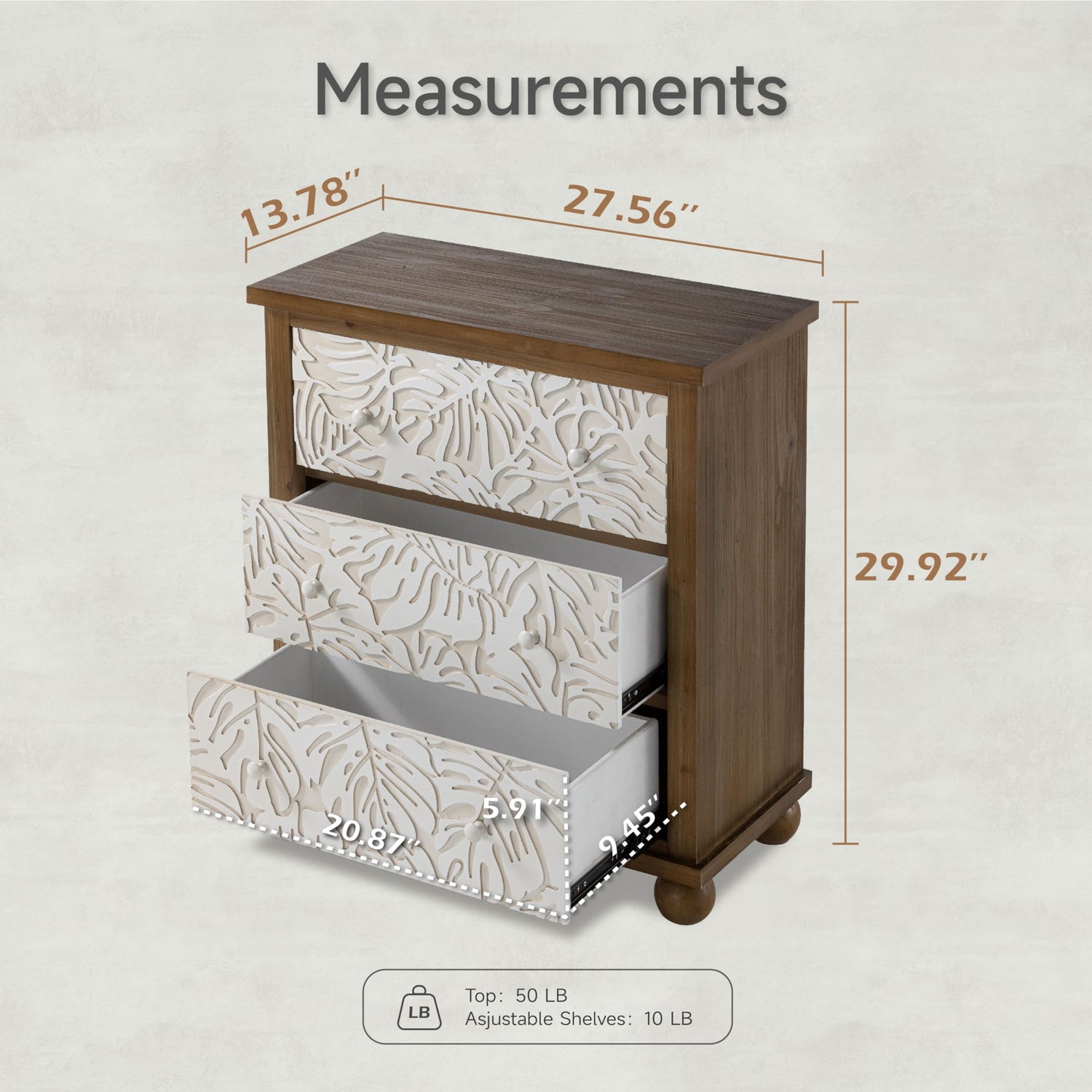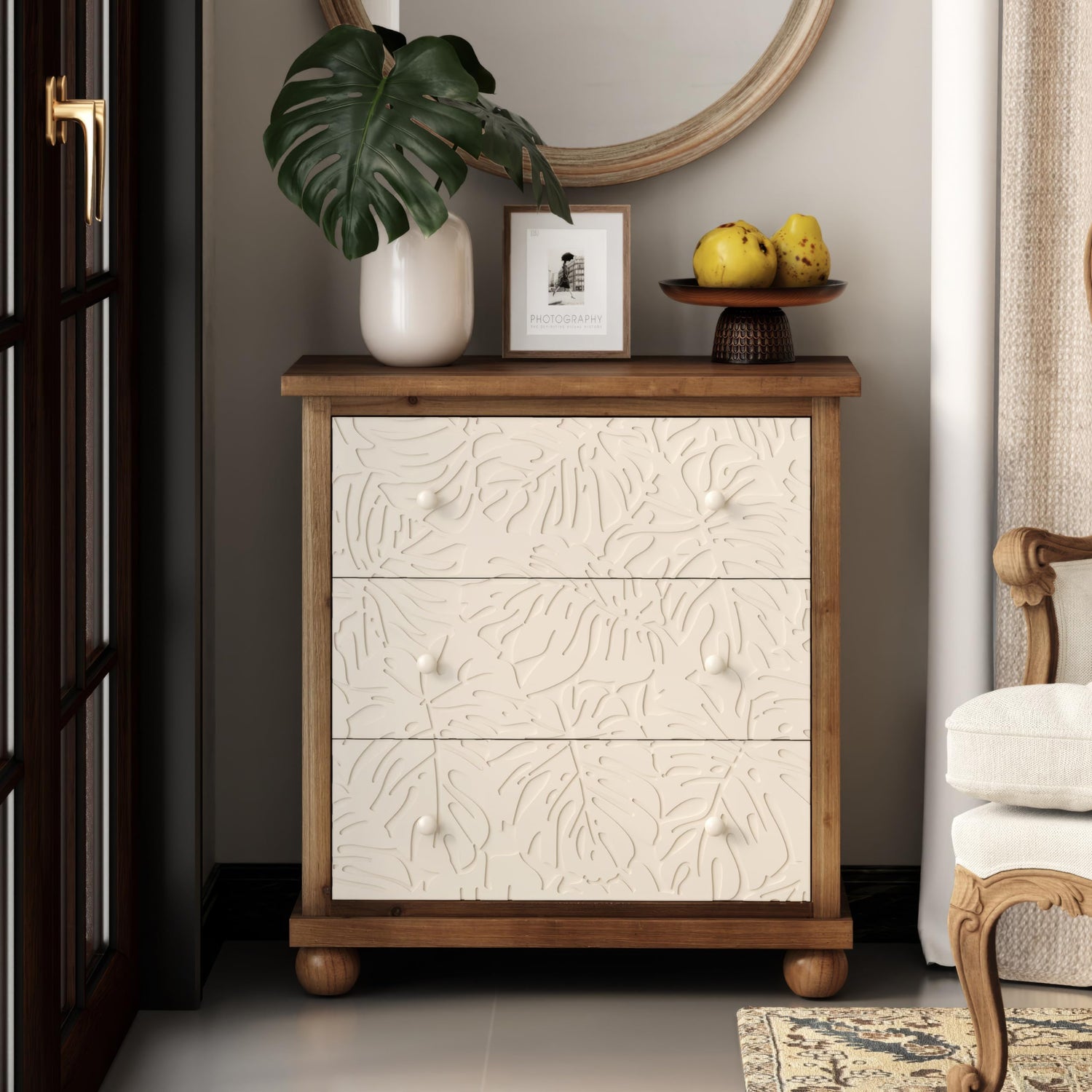 - The dresser showcases a beautiful carved leaf pattern that adds a touch of nature-inspired elegance to your room. The white leaf design contrasts wonderfully with the natural wood frame, creating a striking visual appeal.