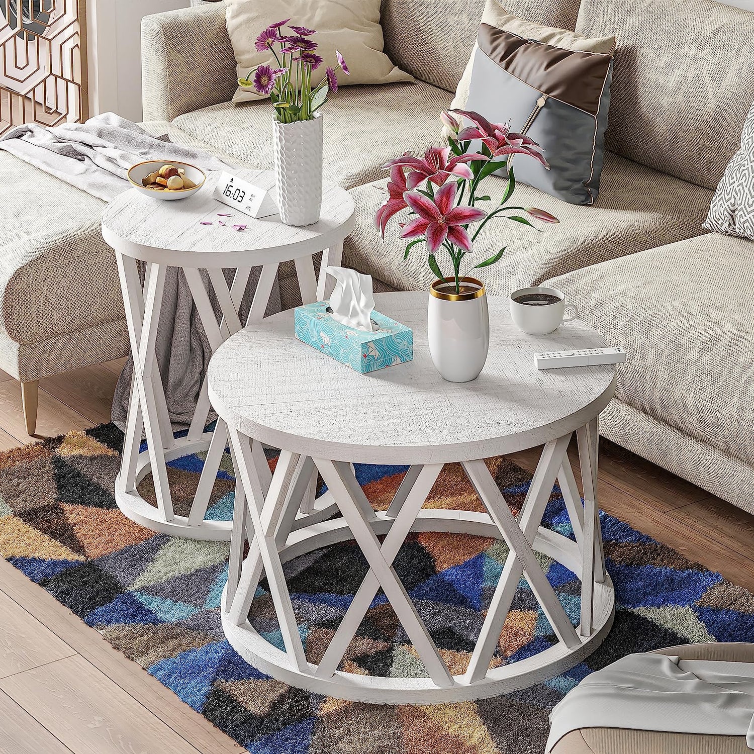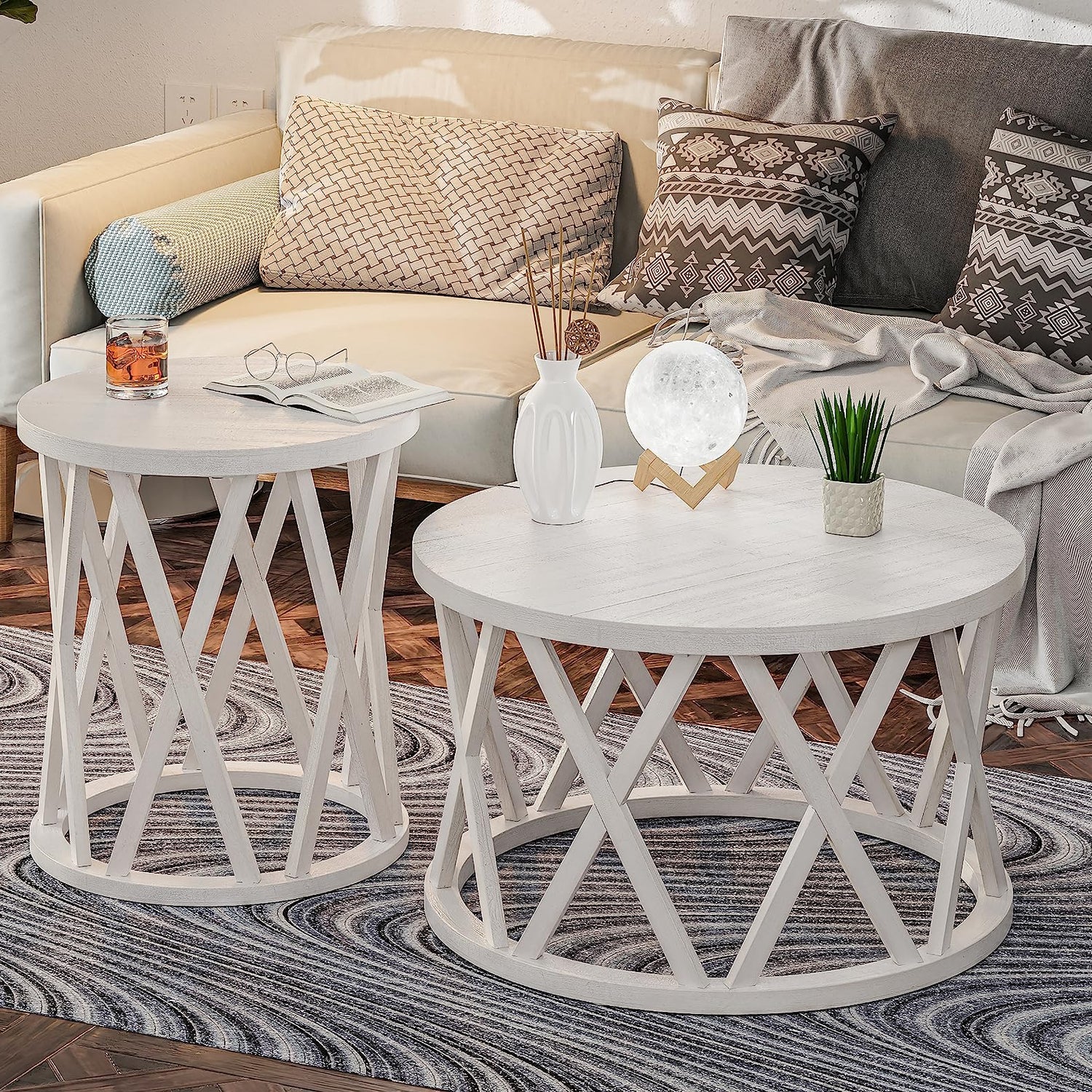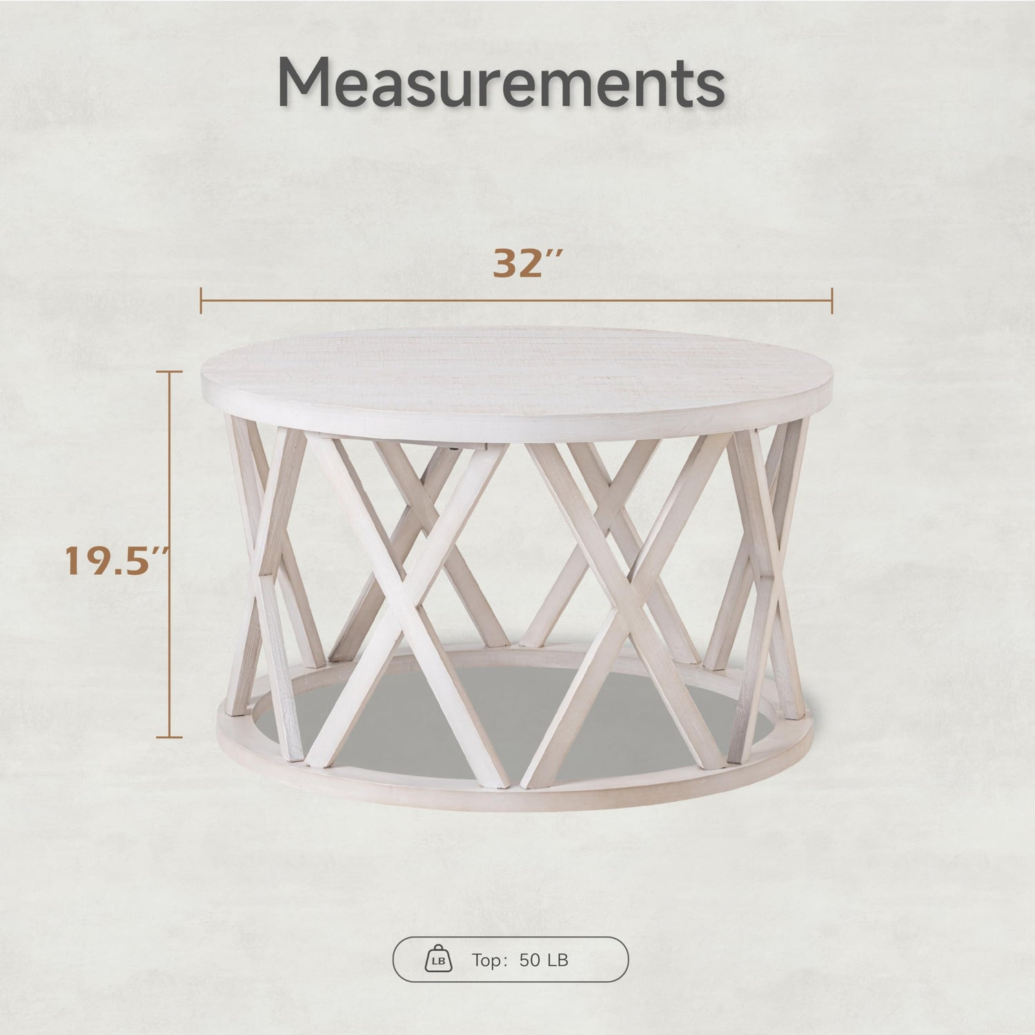 COZAYH Farmhouse Coffee Table, Rustic Round Coffee Table with X-Motifs Legs, Wood Textured Top, for Boho, French Country Decor, Antique White