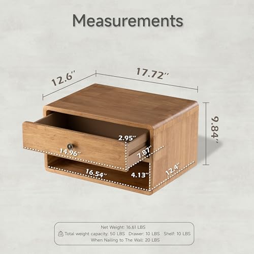 - ✅【Measurements】: Overall dimensions 12.6” D x 17.72” W x 9.84” H. When being mounted on the wall, its support up to 20 lbs (including the desktop and drawer).