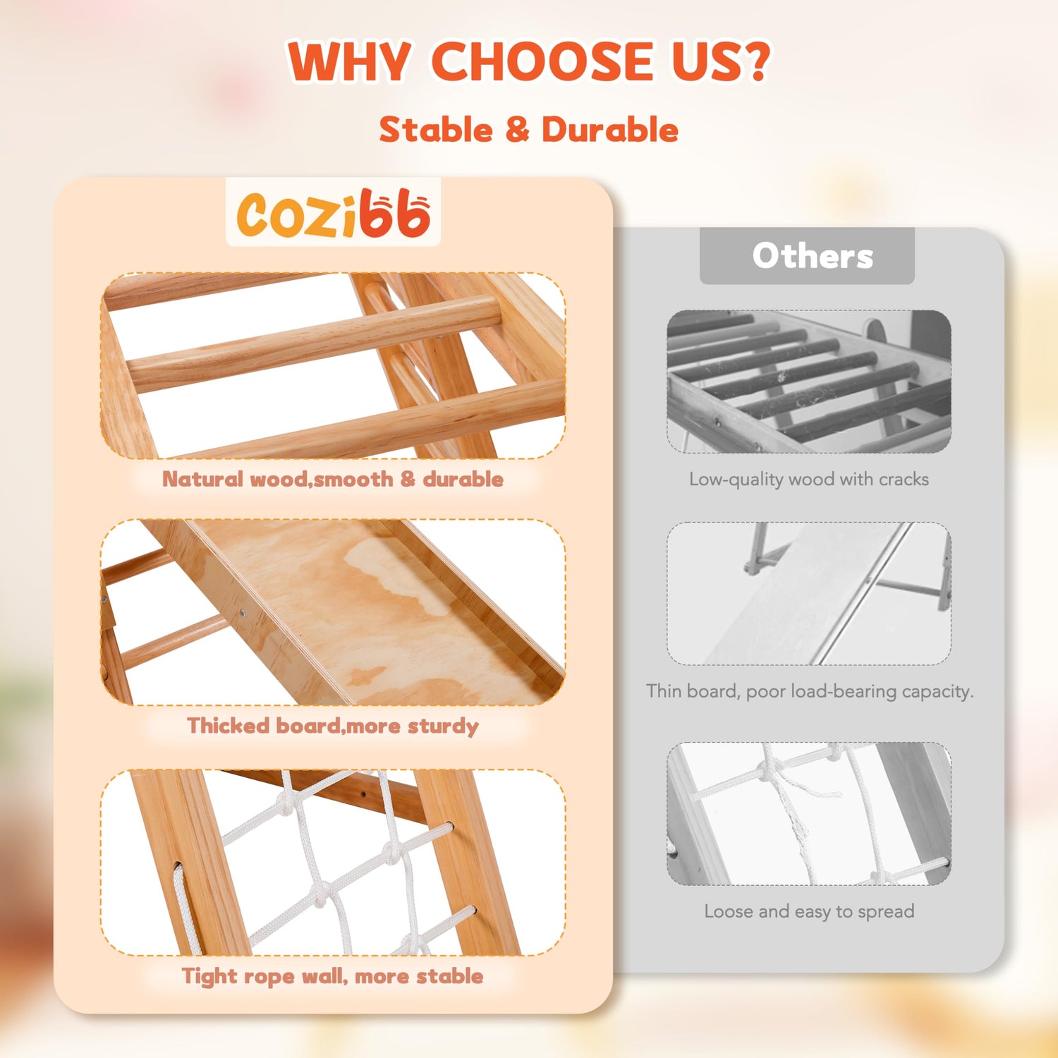- 【ASTM Certified & Safe Material】Safety and reliability are our top priority. Our indoor playground are made of sturdy, durable, industrial-grade wood, designed for long-lasting use. All CoziBB indoor playgrounds are rigorously ASTM certified to ensure child safety. And the surface is polished to ensure there are no burrs.Baby jungle gym indoor can hold up to 180 pounds and are suitable for almost any kids to play on